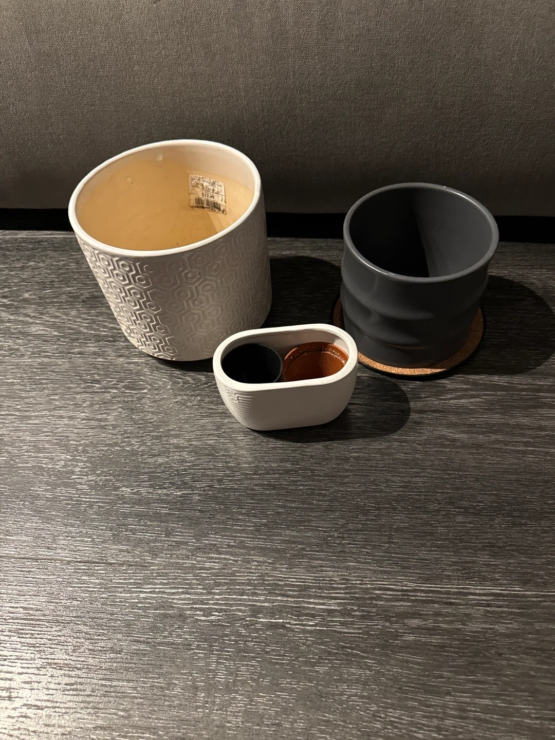 Three decorative planters in various sizes and materials. Includes one textured white ceramic planter, a dark grey ceramic planter, and a small white ceramic planter with two compartments. Great for small plants or succulents!