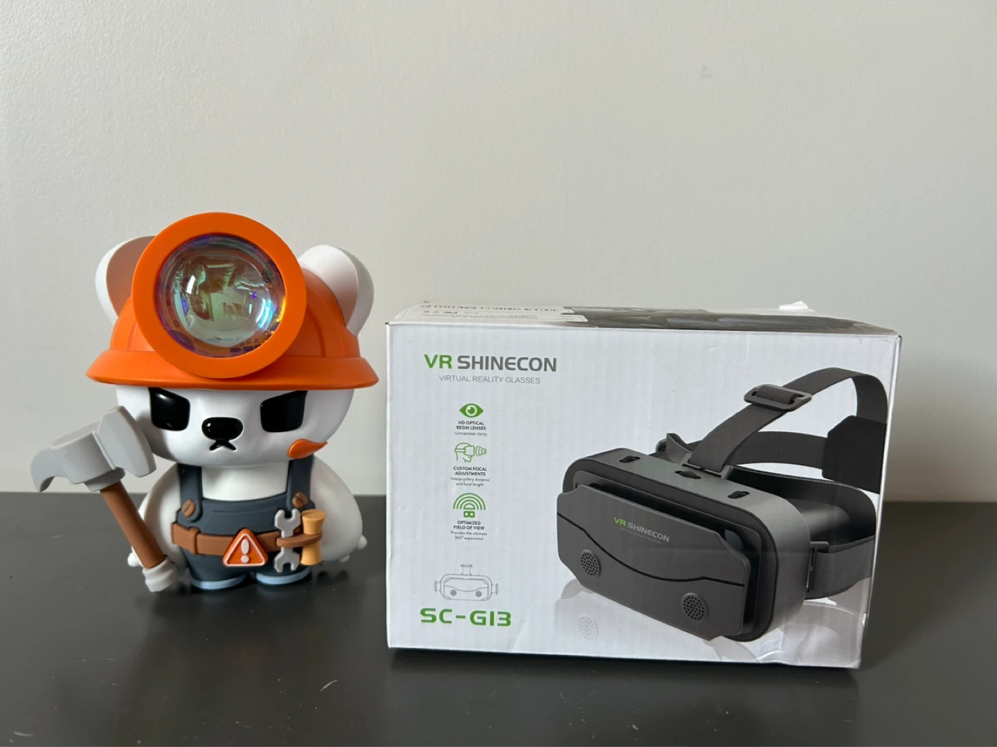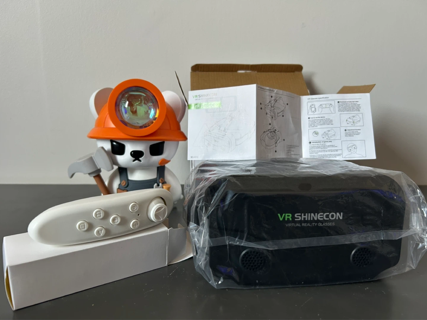 SHINECON VR Virtual Reality Glasses, model SC-G13. Suitable for 4.7-7 inch mobile phones. Features adjustable lens and head strap. Includes original box and remote.