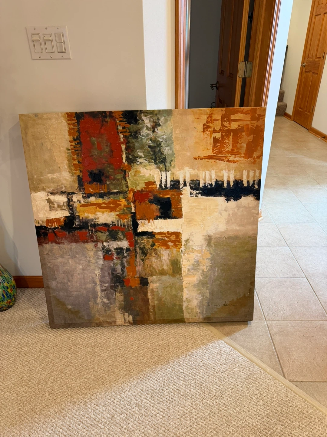This is a large abstract painting with a rich color palette. Its textured surface adds depth and visual interest. It's ready to hang and would be a striking addition to any room!