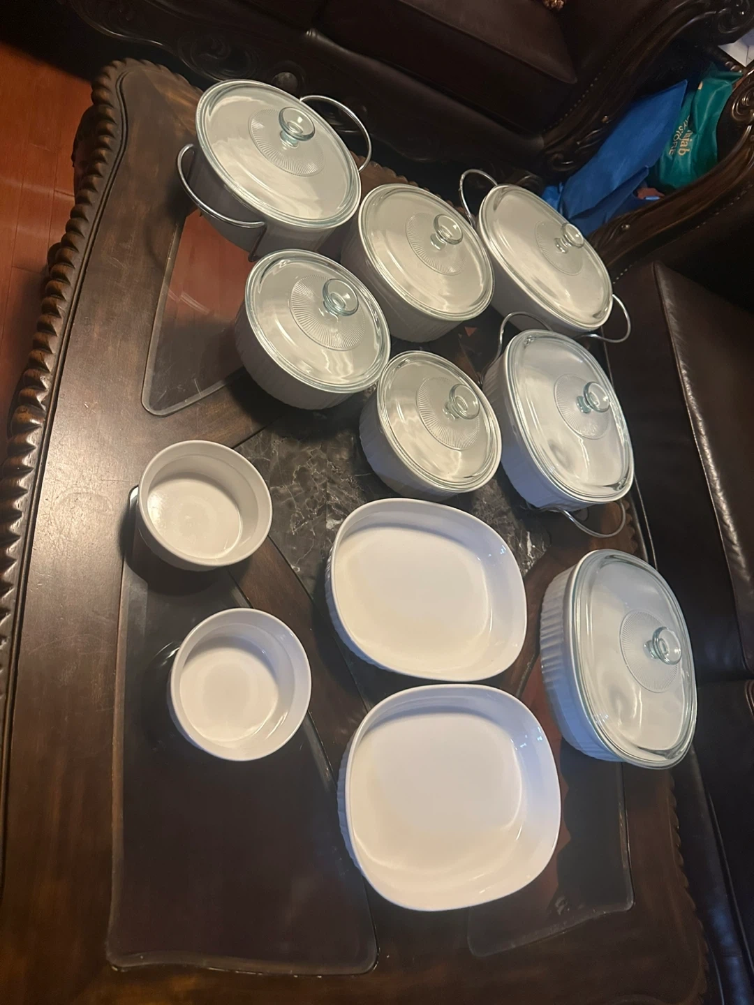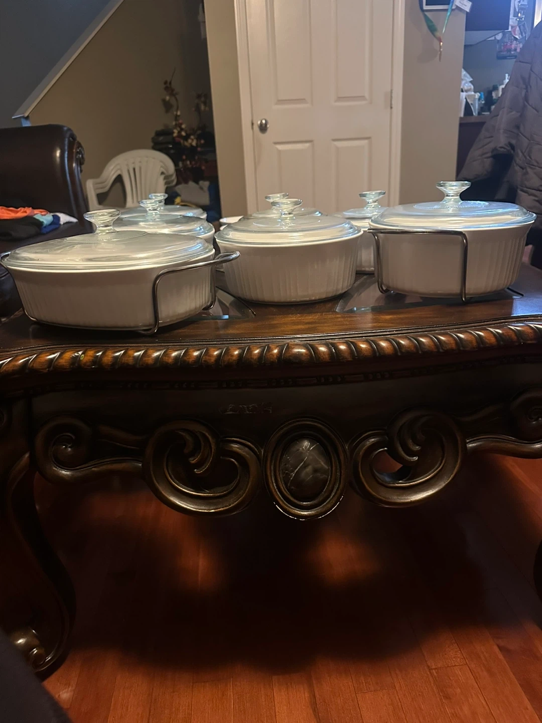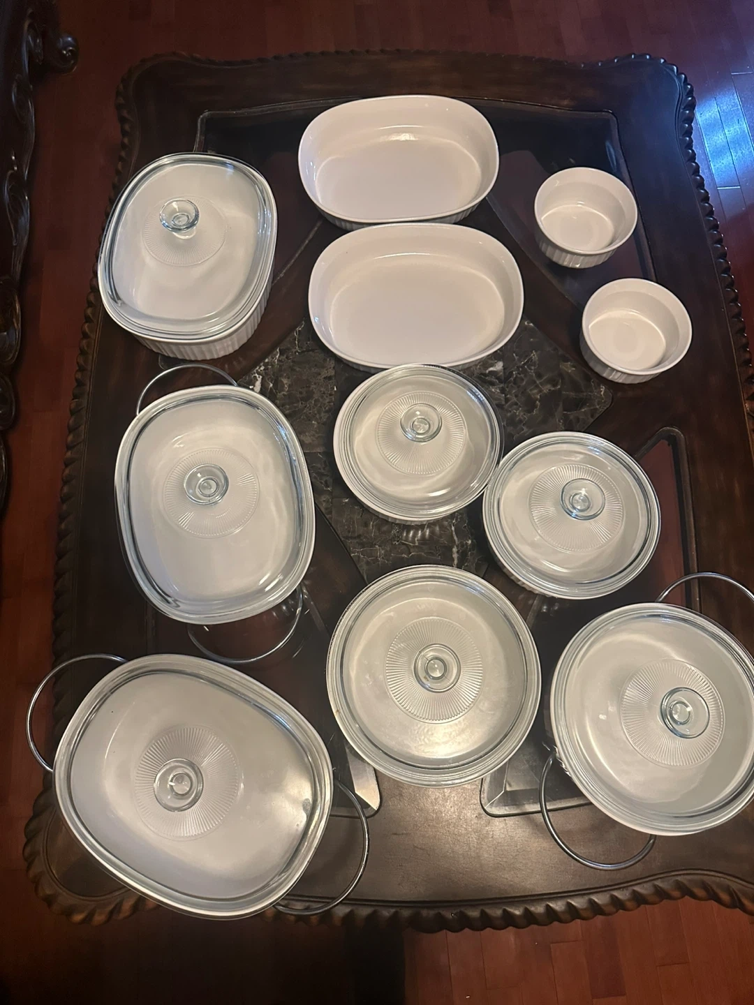 This is a set of Pyrex casserole dishes with glass lids. It includes various sizes for different cooking needs. The dishes are made of glass and come with wire racks.