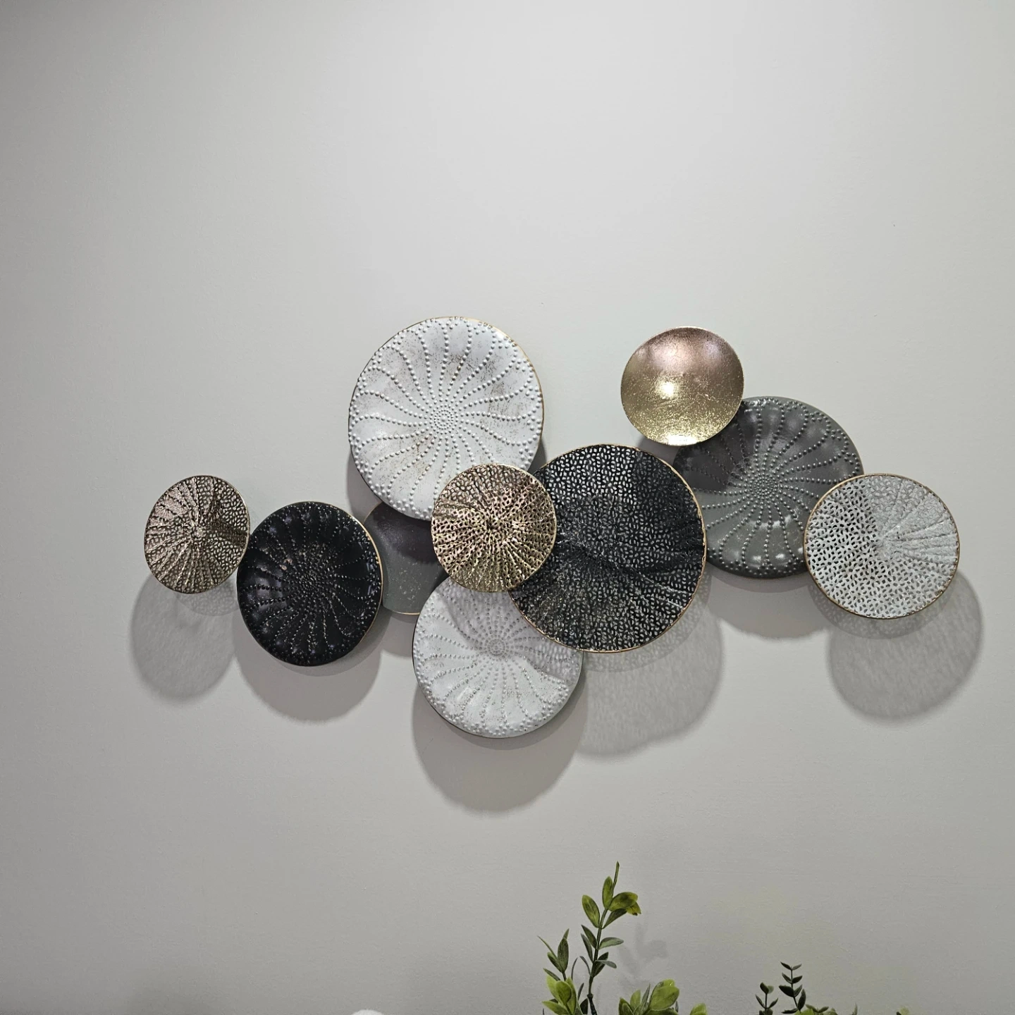 This metal wall art features a collection of circular discs in various textures and finishes. It includes colours like black, white, grey, and metallic gold and rose gold accents. It's a unique piece to liven up any room. The embossed patterns add depth and visual interest.