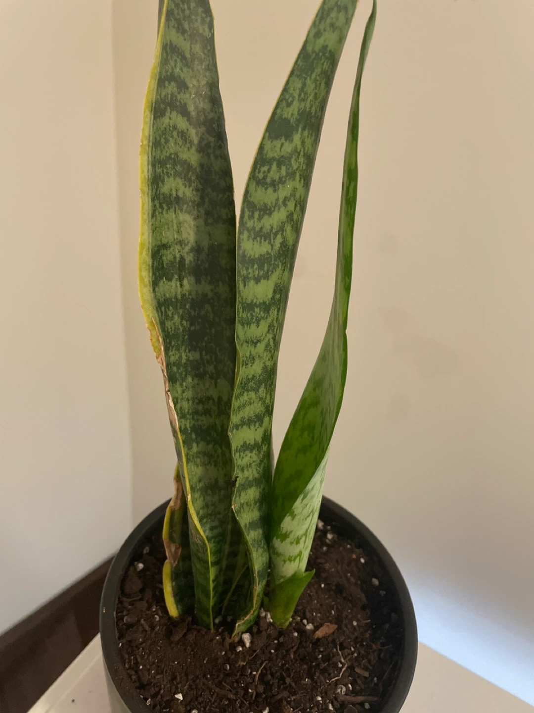This is a healthy snake plant in a black pot. It's easy to care for and adds a nice touch to any room. This plant is known for its air-purifying qualities.