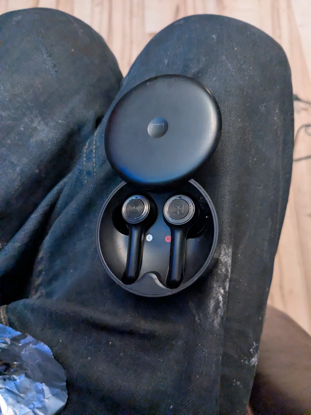 Black Monster wireless earbuds. Includes charging case for convenient on-the-go power. These earbuds offer a comfortable fit for extended listening. Great for daily commutes or workouts!