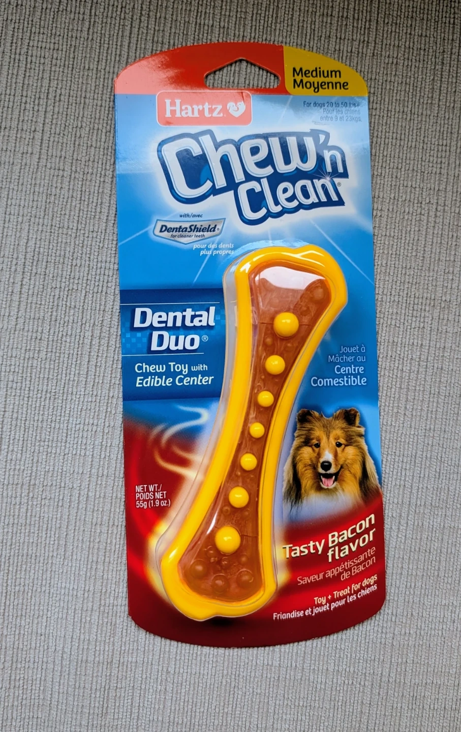 This Hartz Chew 'n Clean Dental Duo chew toy is designed for dogs 20 to 50 lbs. It features DentaShield and an edible center. It's made with artificial bacon flavour.