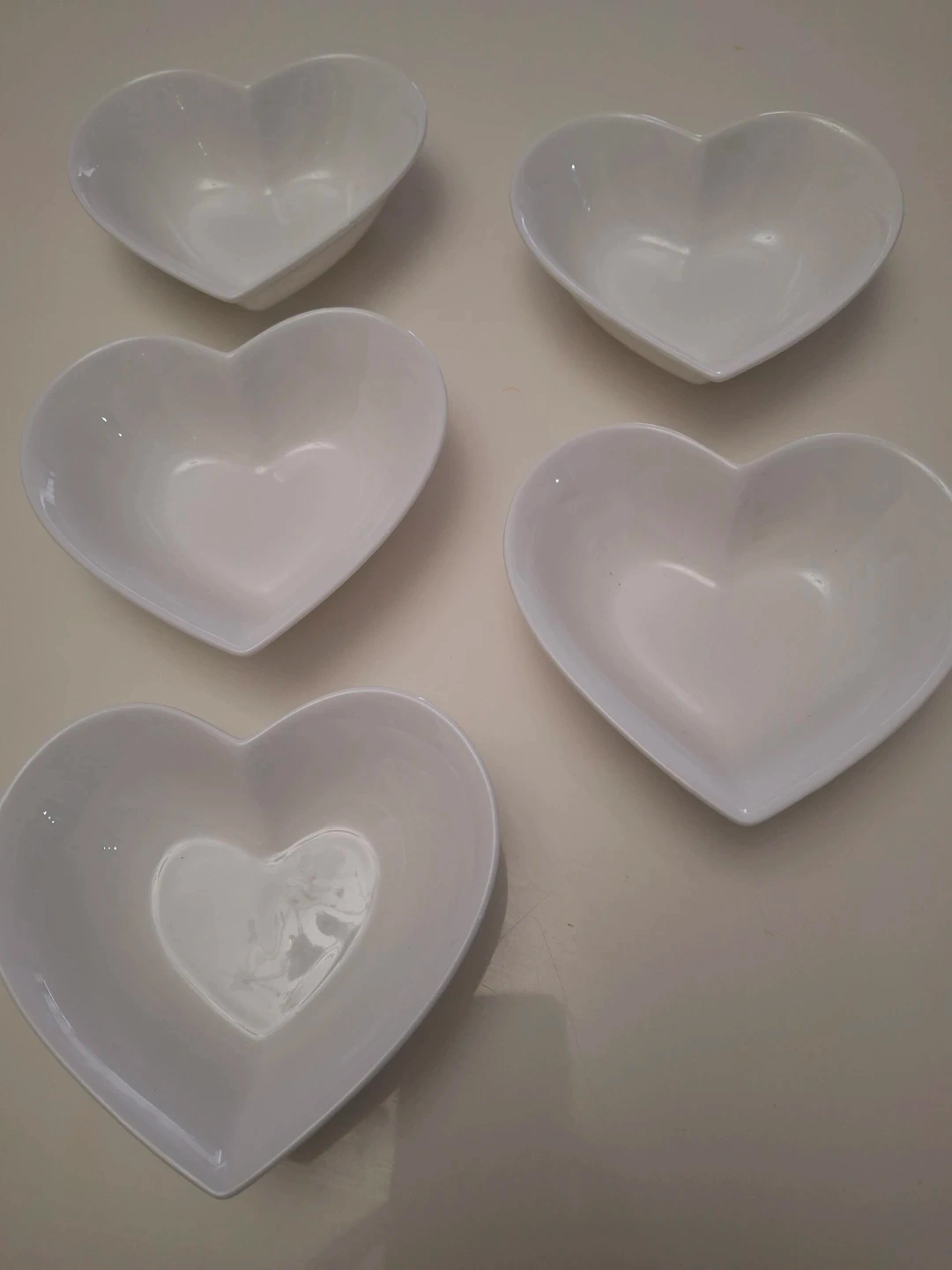 Selling a set of 5 adorable heart-shaped bowls! They're perfect for snacks, desserts, or adding a touch of love to your table setting. The bowls are in great condition and ready to be enjoyed.