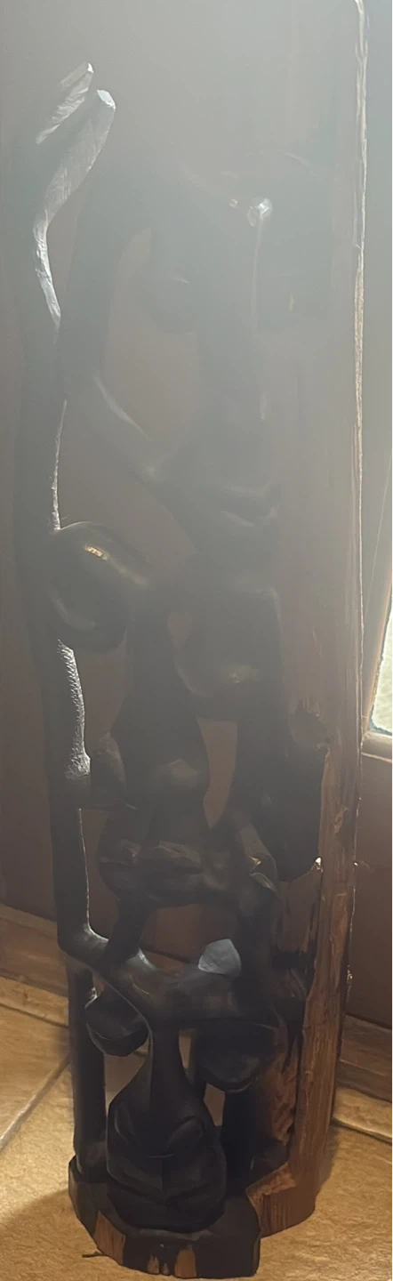 This is a unique, hand-carved wooden sculpture featuring intertwined figures and a natural wood edge. It's a striking piece for home decor. It would look great as a statement piece in a living room or entryway.
