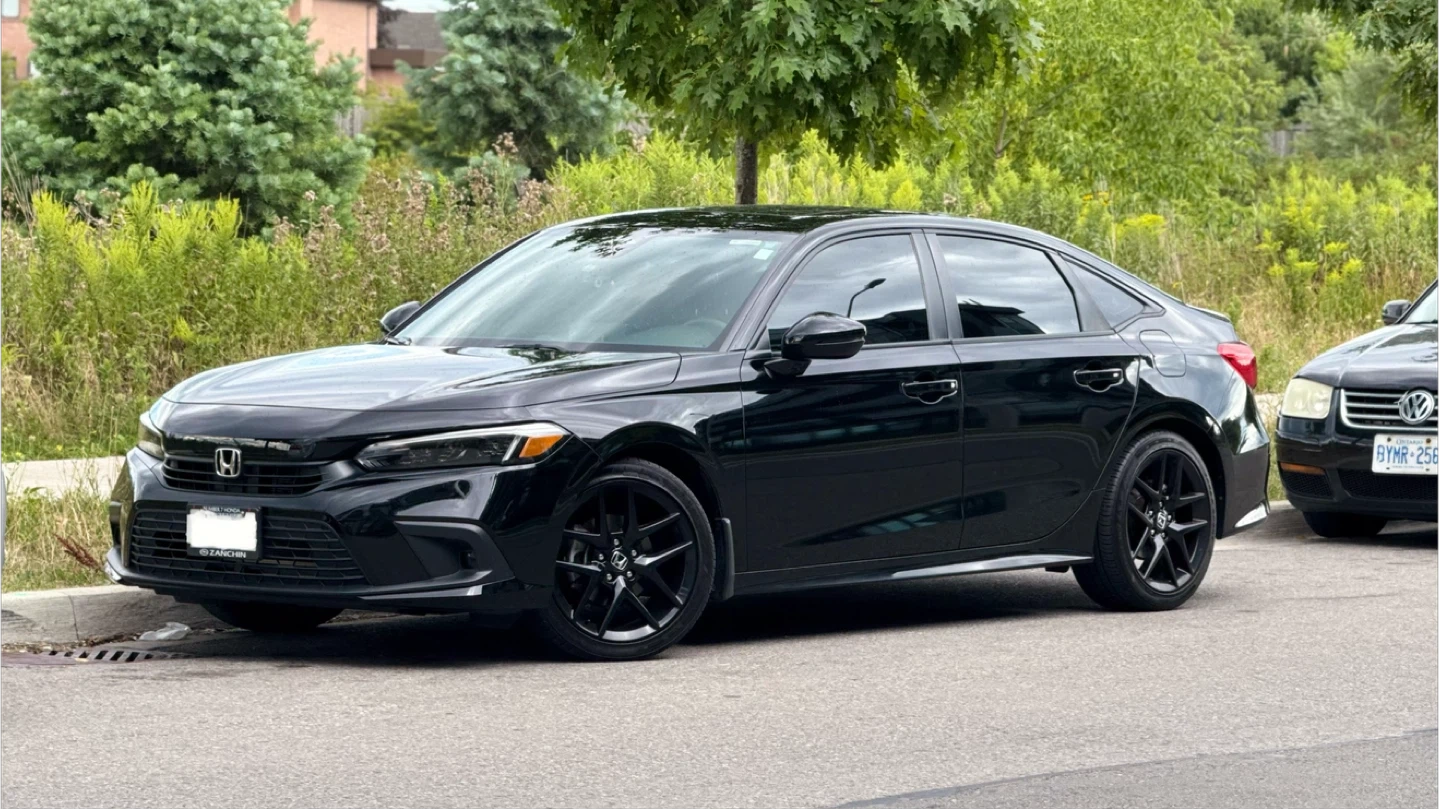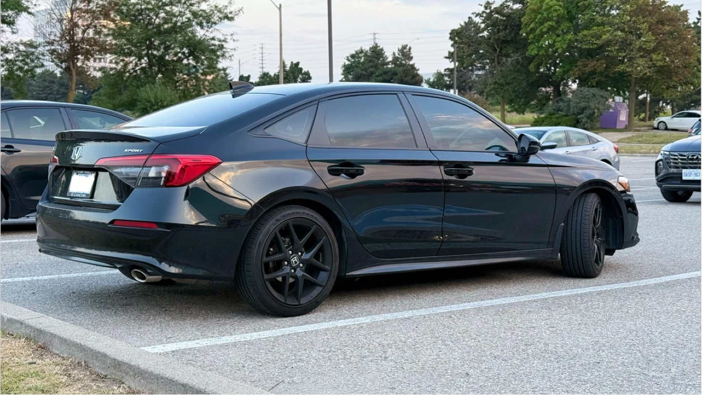 Black 2024 Honda Civic Sport sedan. Comes with alloy wheels and a sport body kit. Low mileage and well-maintained.