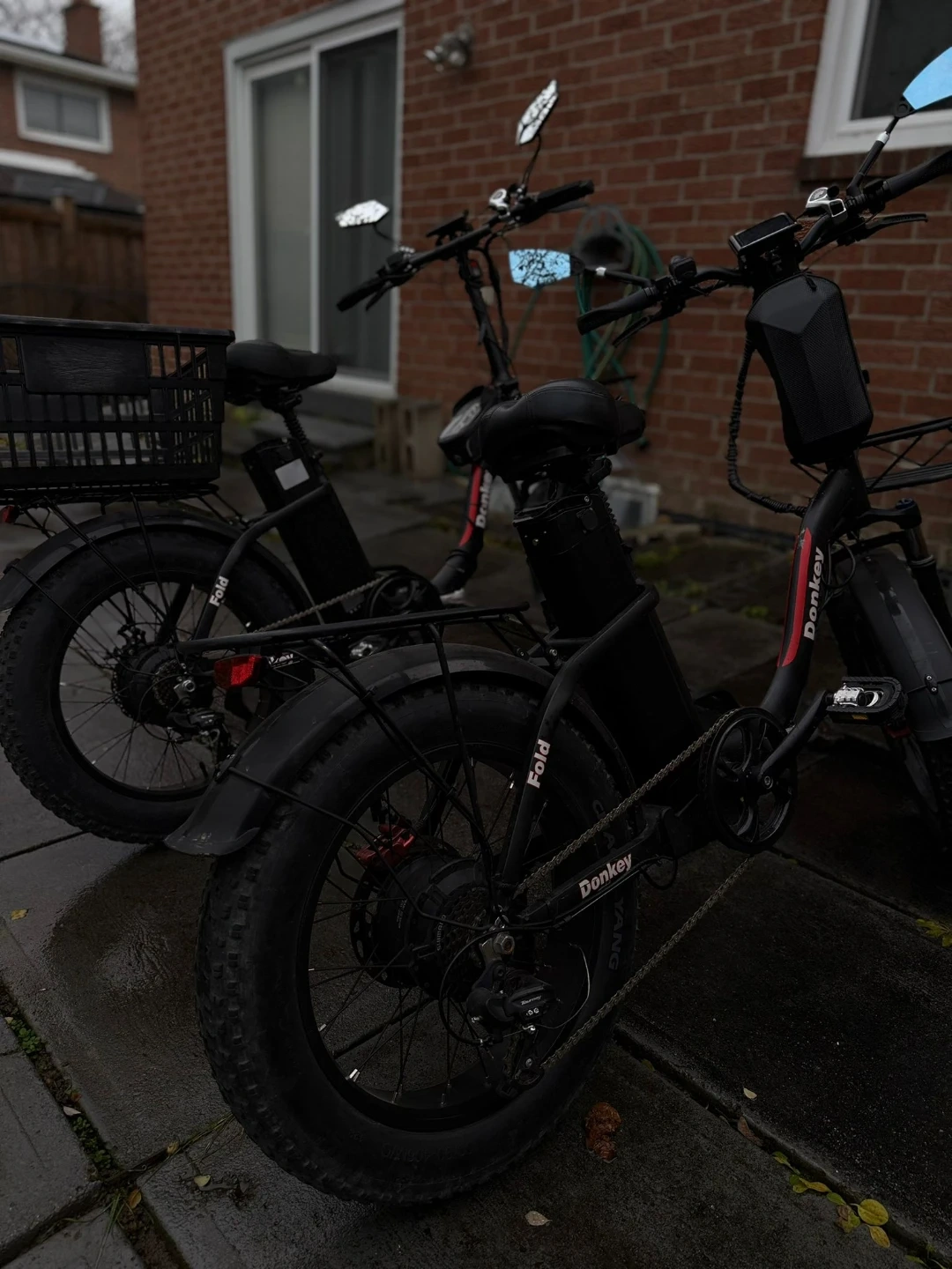 Donkey Fold fat tire electric bike. Features a foldable frame for easy storage and transport. Comes with a rear cargo basket. Fat tires for all-terrain capability. Ready for your next adventure!