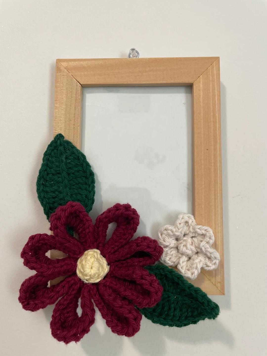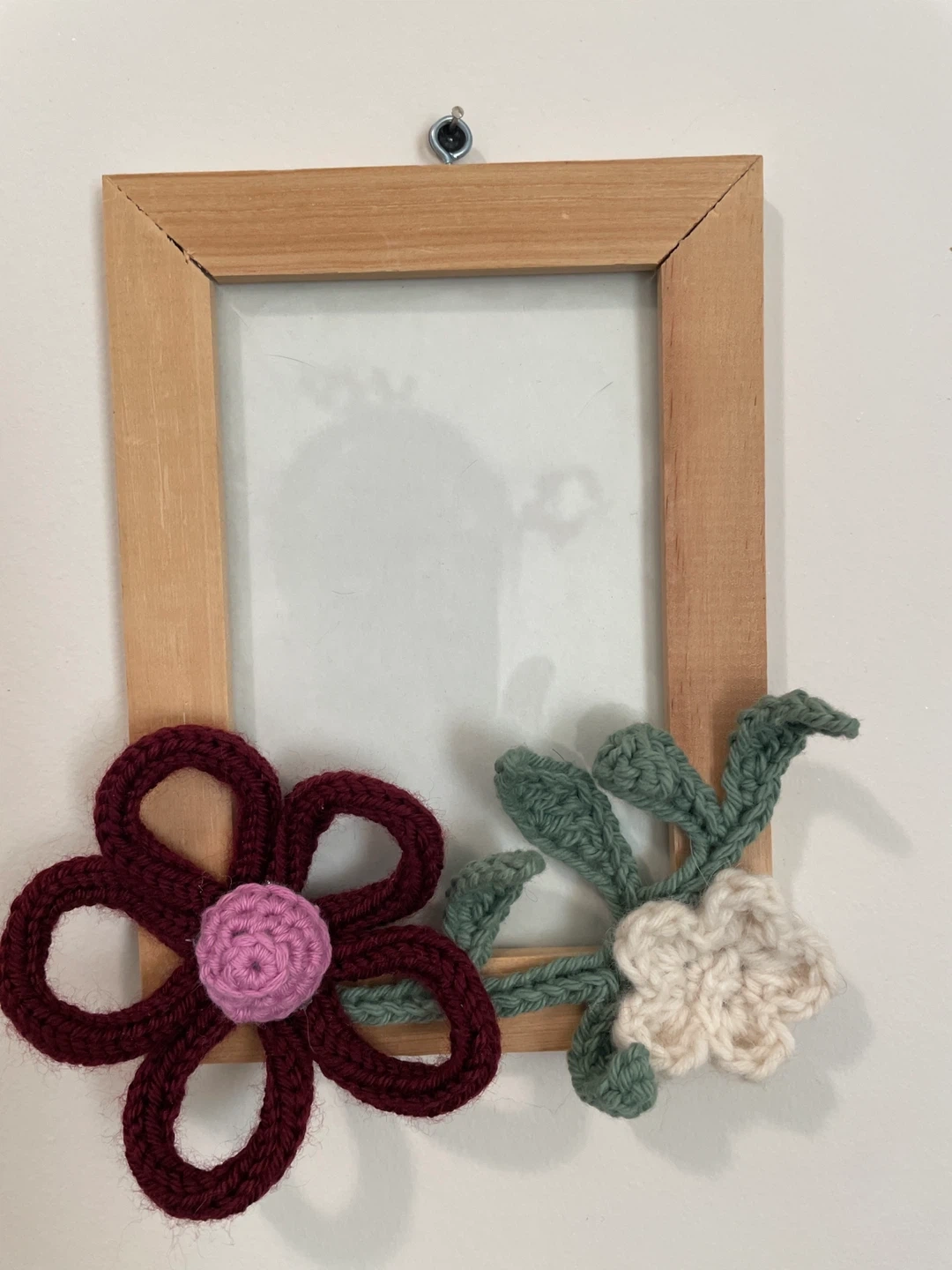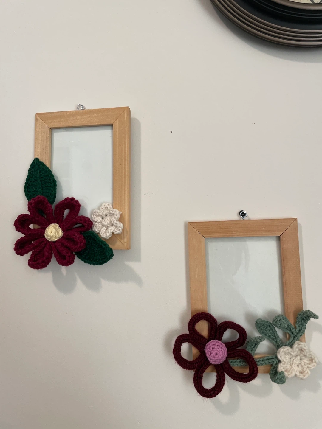 I'm selling a set of two handmade picture frames, each decorated with crocheted flowers and leaves! They're made with a wooden frame and have unique crocheted details. The frames are approximately 5inches by 7 inches. They'd be a lovely addition to any room
