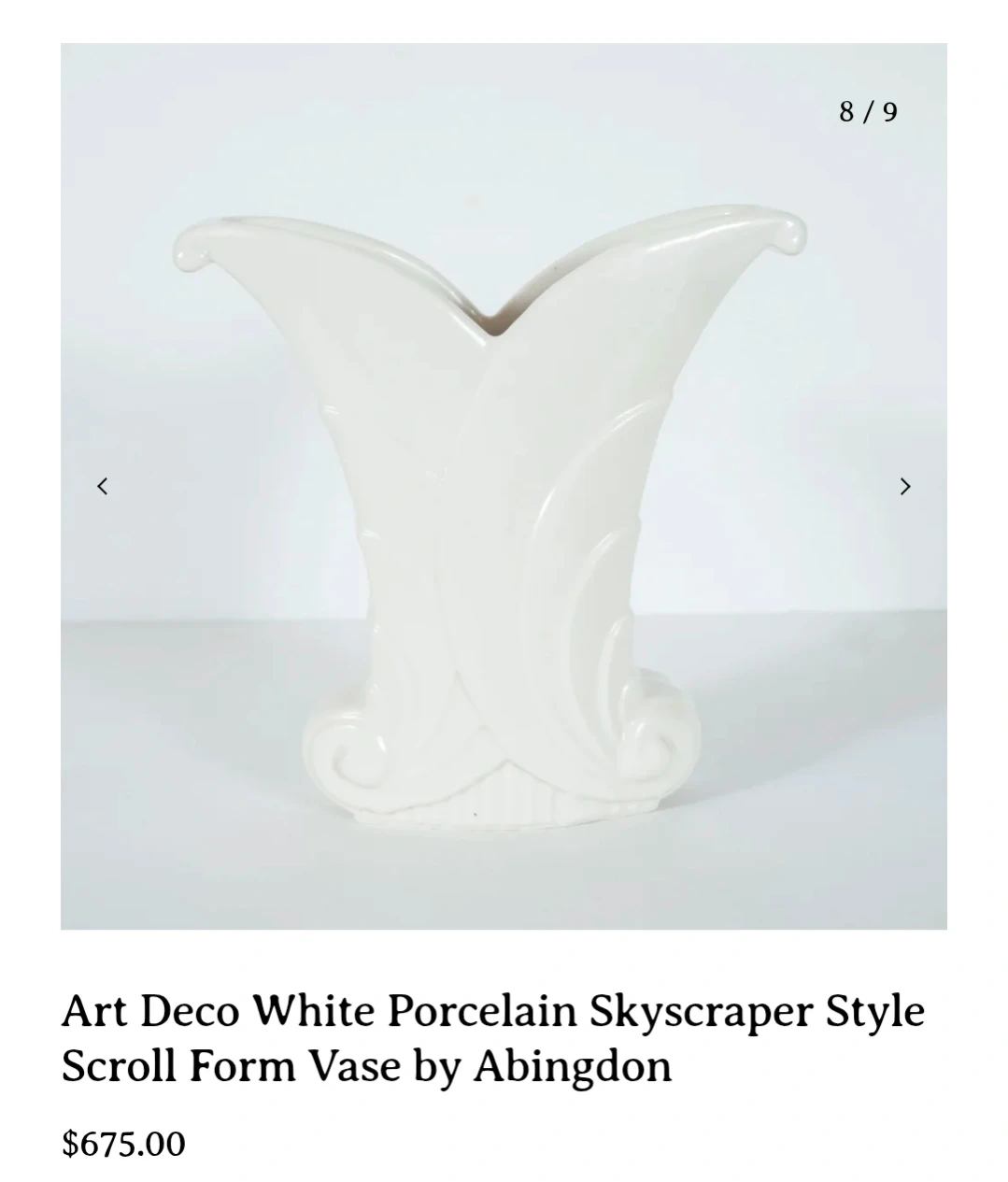 Buy & SellAbingdon Cream Ceramic Art Deco VaseAbingdon Cream Ceramic Art Deco Vase$435Vintage Abingdon cream ceramic vase. Features a unique Art Deco design with swirling motifs. Ceramic material.ConditionLike newWHERE TO MEETDylan's No FrillsView MapSELLERverifiedJoshCentennial750 reviews0 chats·0 favorites·5 viewsSEND CHAT TO SELLERHi Josh! I’m interested in your listing.Hi Josh! I’m interested in your listing.Get the Karrot app to chatSign In to chat