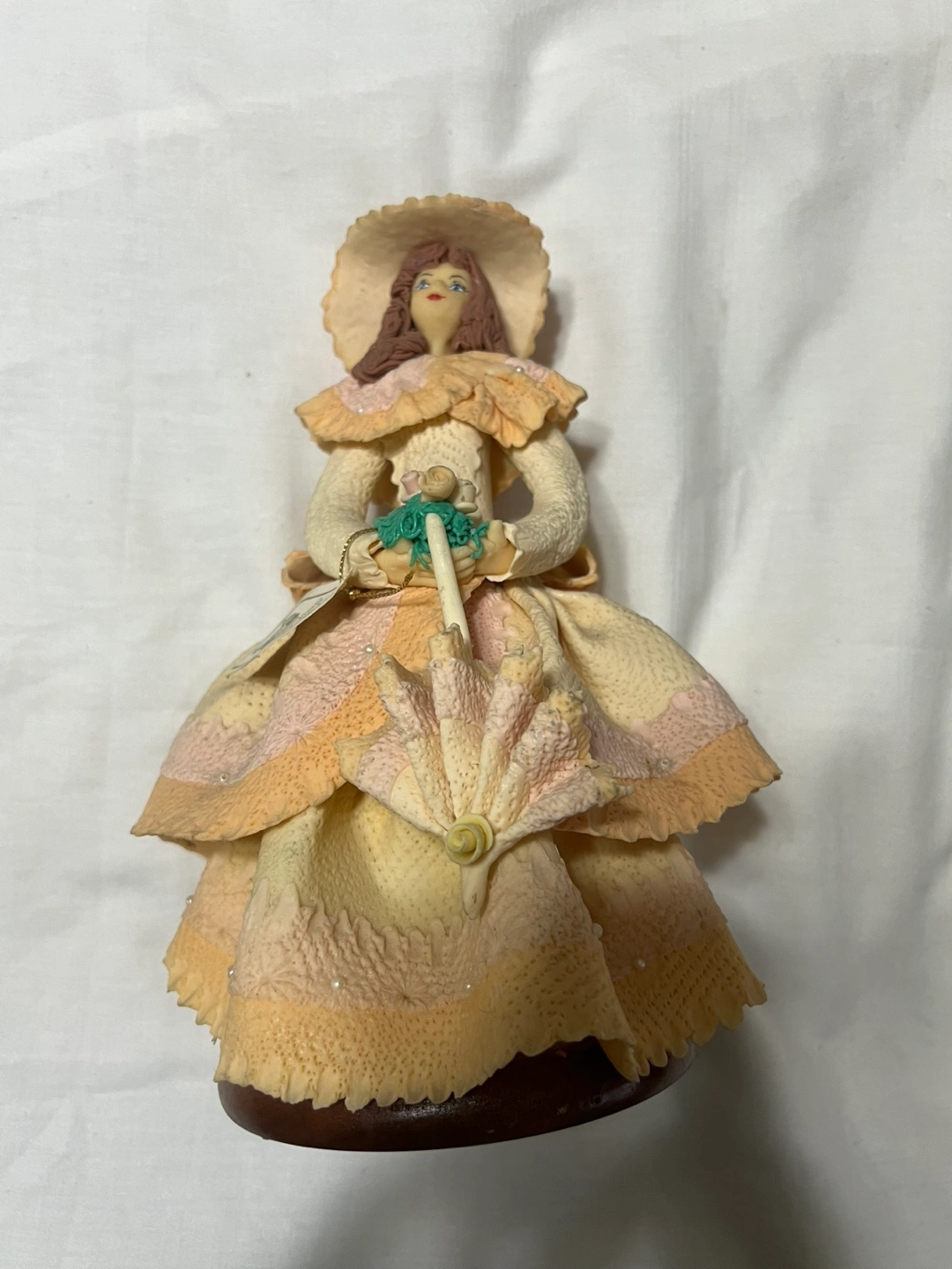 Unique handcrafted figurine. Intricate detailing. Peach and cream colored dress. Holding a small bouquet and umbrella. Wooden base. Collectible item.