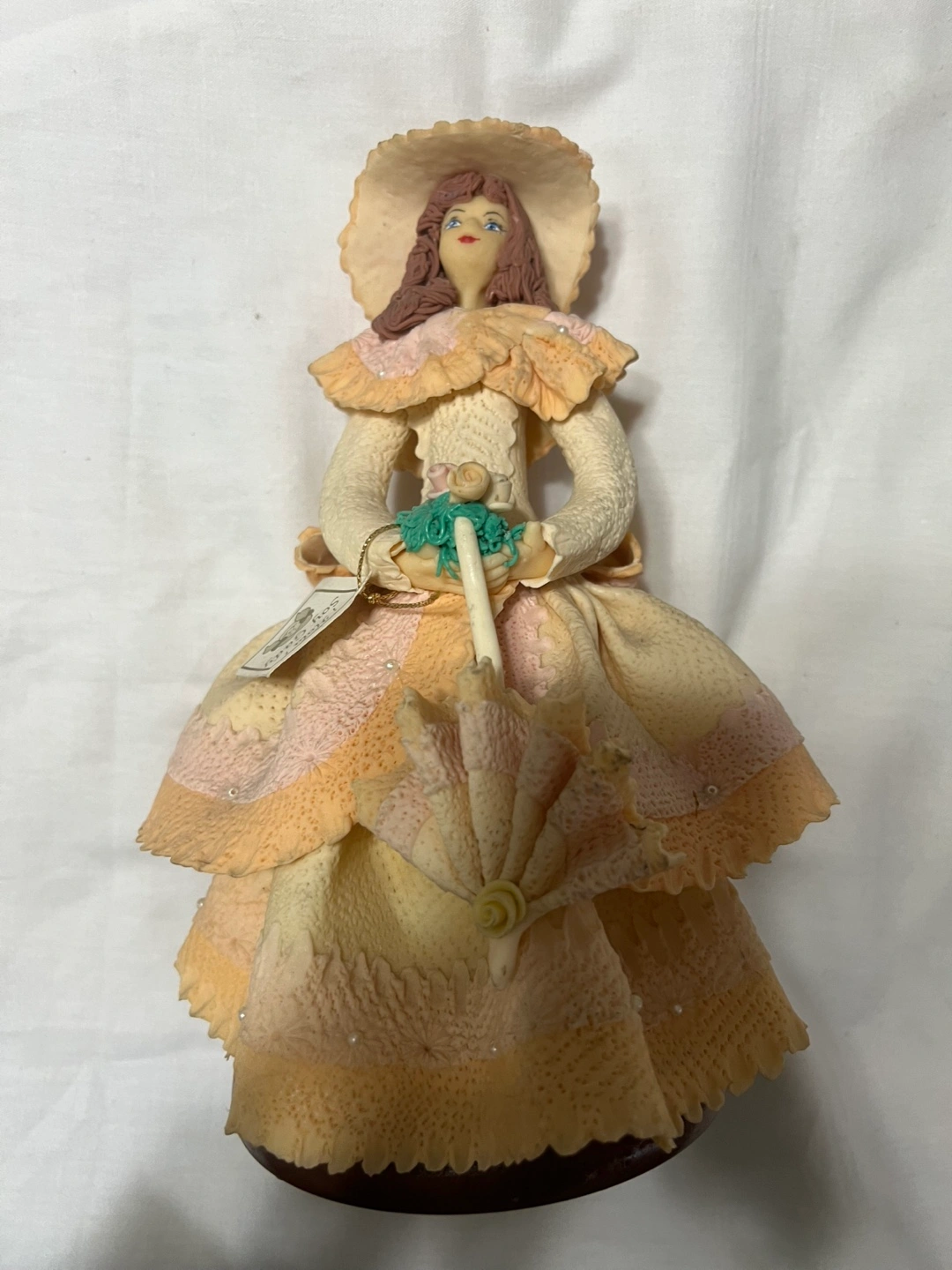 Unique handcrafted figurine. Intricate detailing. Peach and cream colored dress. Holding a small bouquet and umbrella. Wooden base. Collectible item.