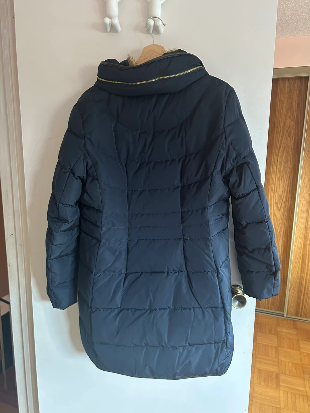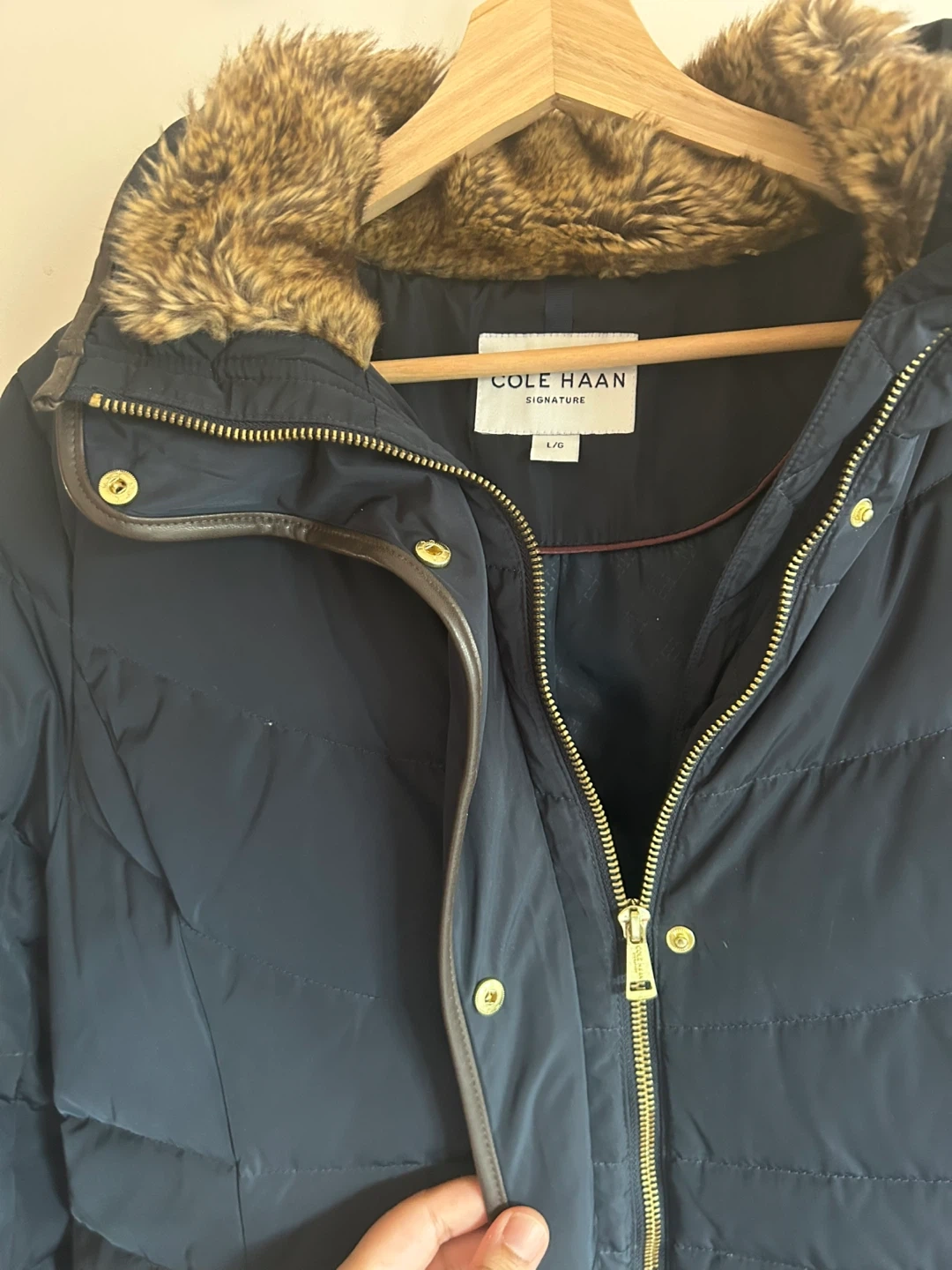 Women’s navy puffer jacket from Cole Haan. Features a faux fur-lined hood and brown faux leather trim. Zipper closure with snap buttons. Zippered pockets. Size Large.