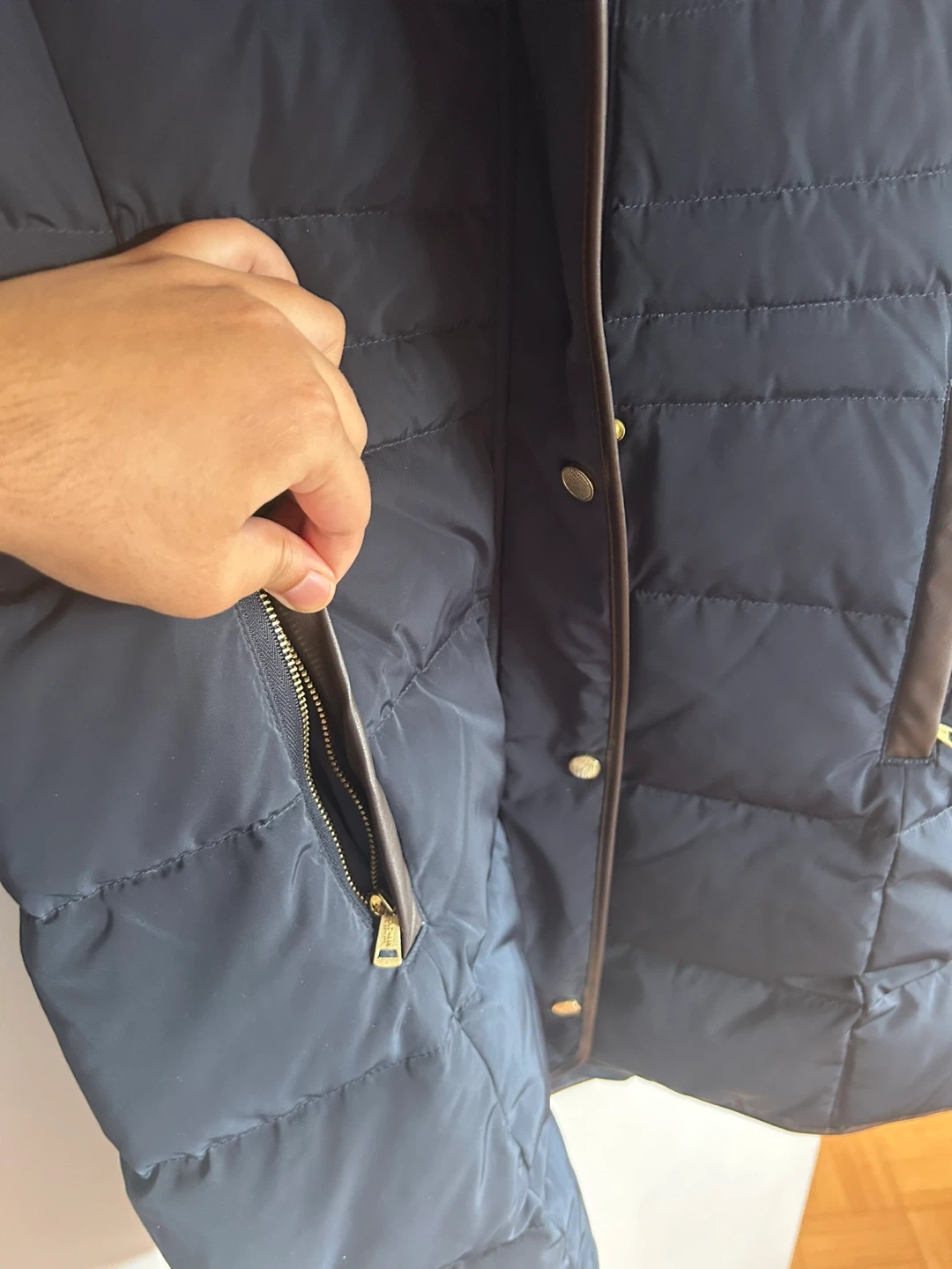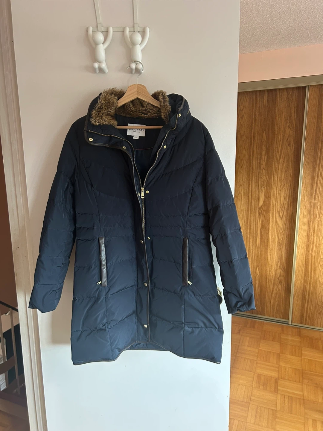 Women’s navy puffer jacket from Cole Haan. Features a faux fur-lined hood and brown faux leather trim. Zipper closure with snap buttons. Zippered pockets. Size Large.