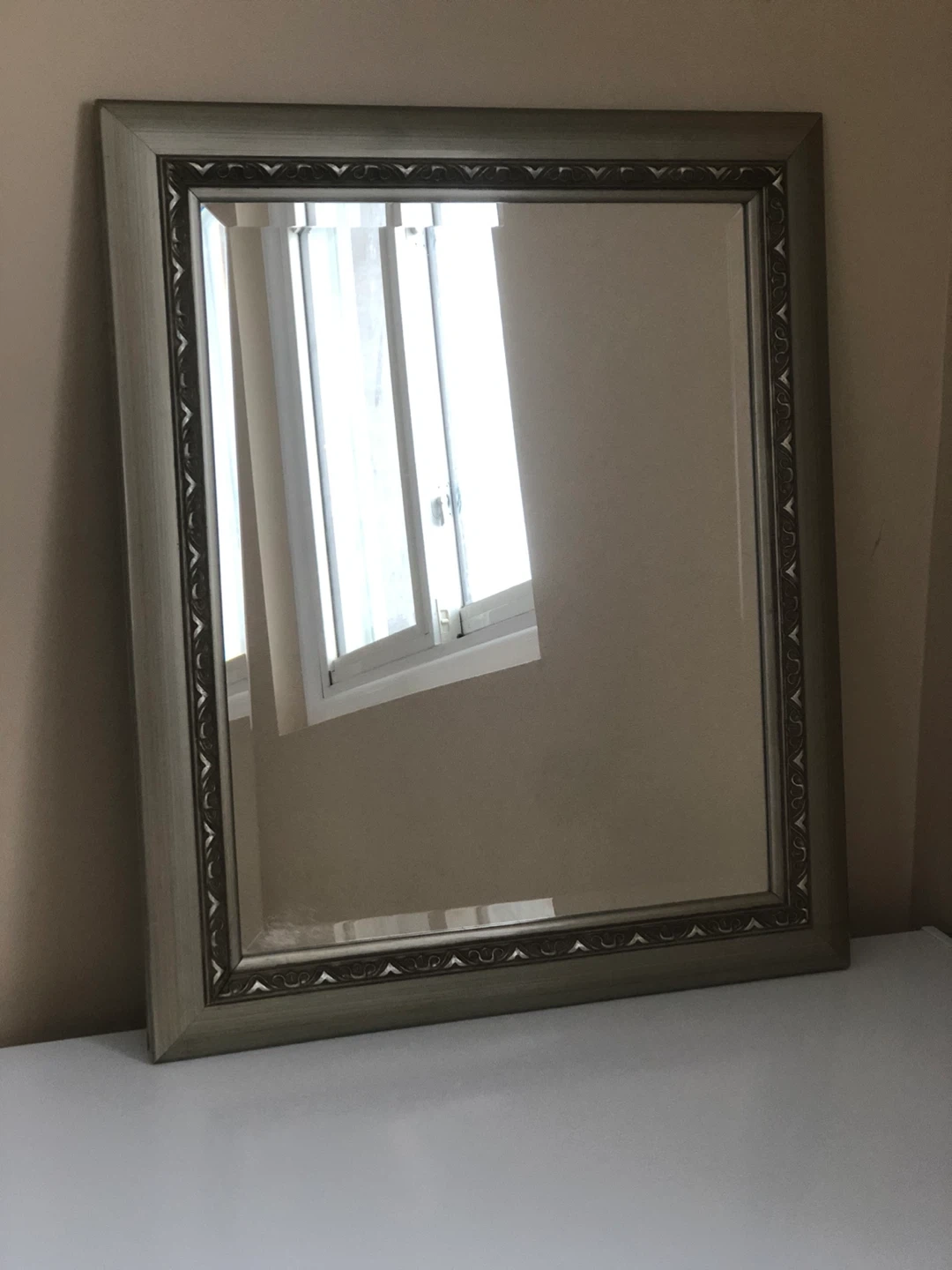 A rectangular wall mirror with an ornate silver-toned frame. It's ready to hang in any room. This mirror's classic design complements most decor styles.