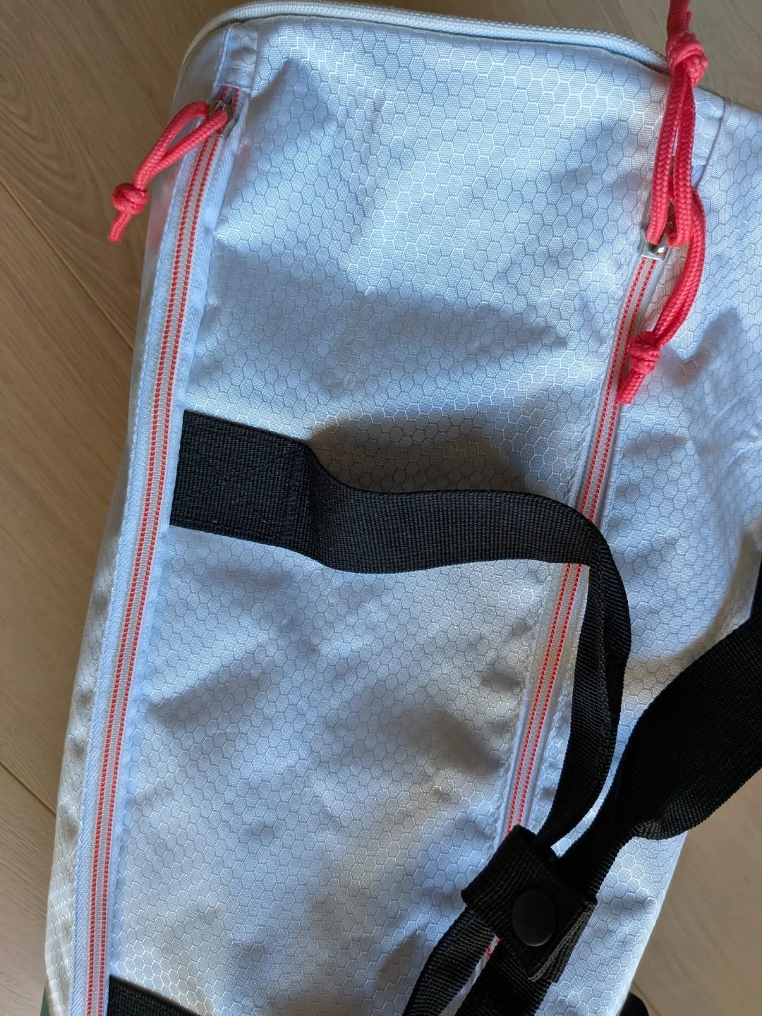 Add some colours to your workouts! Fell in love with this duffle bag but it's never quite fulfilled its gym potential - used it a handful of times for short trips but mainly to hold other bags. Measures approximately 10 inches in diameter and about 17.5" in width with one main compartment and a front compartment. Zippers all glide smoothly. Note some tugged threads/strings on the strap, some faded colours on the logo and a tiny yellow stain (see photos) but otherwise it's like new.