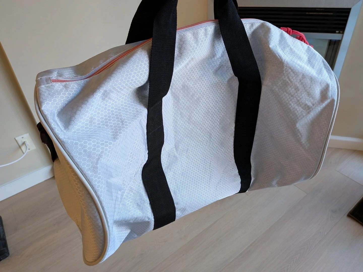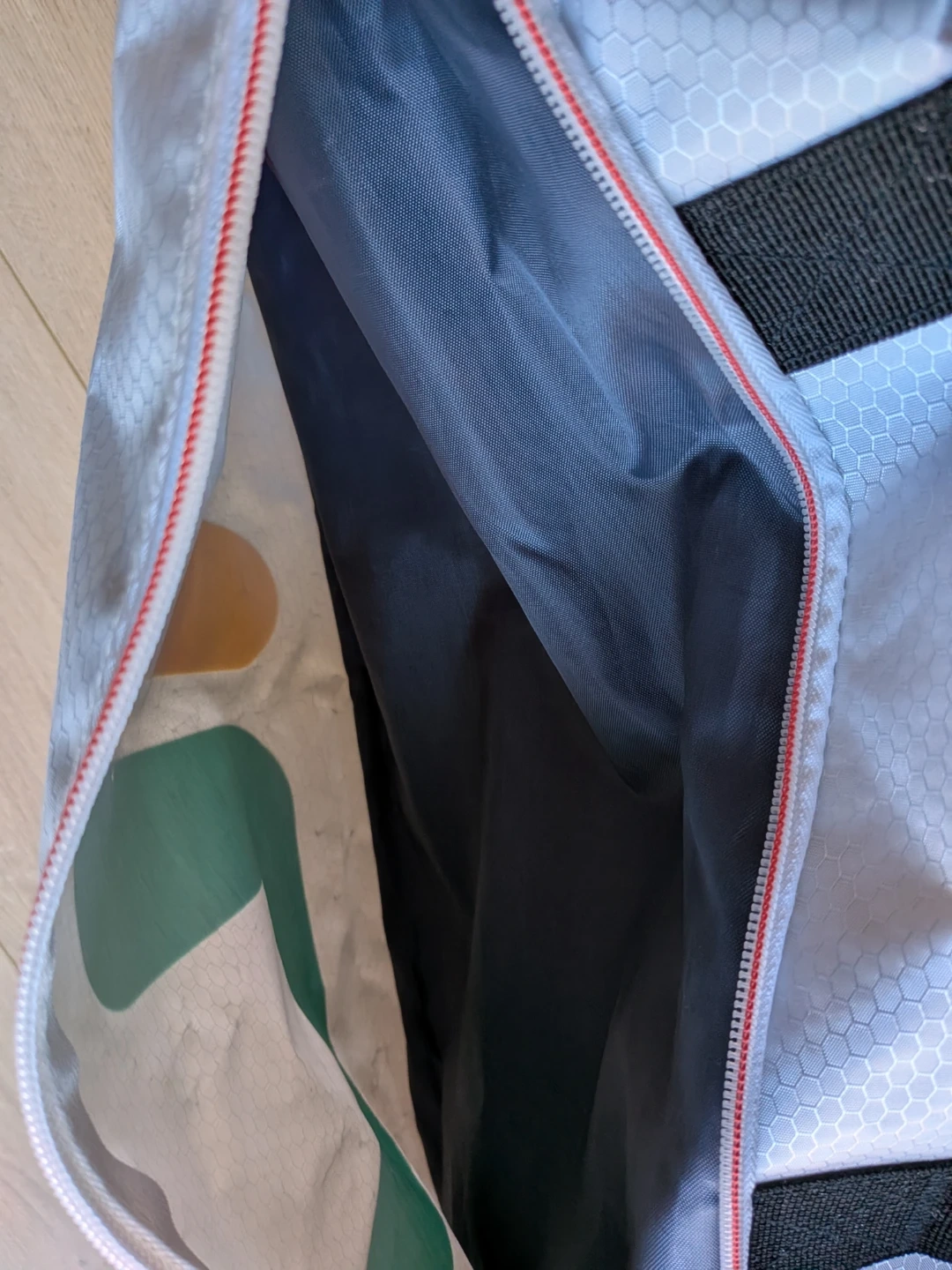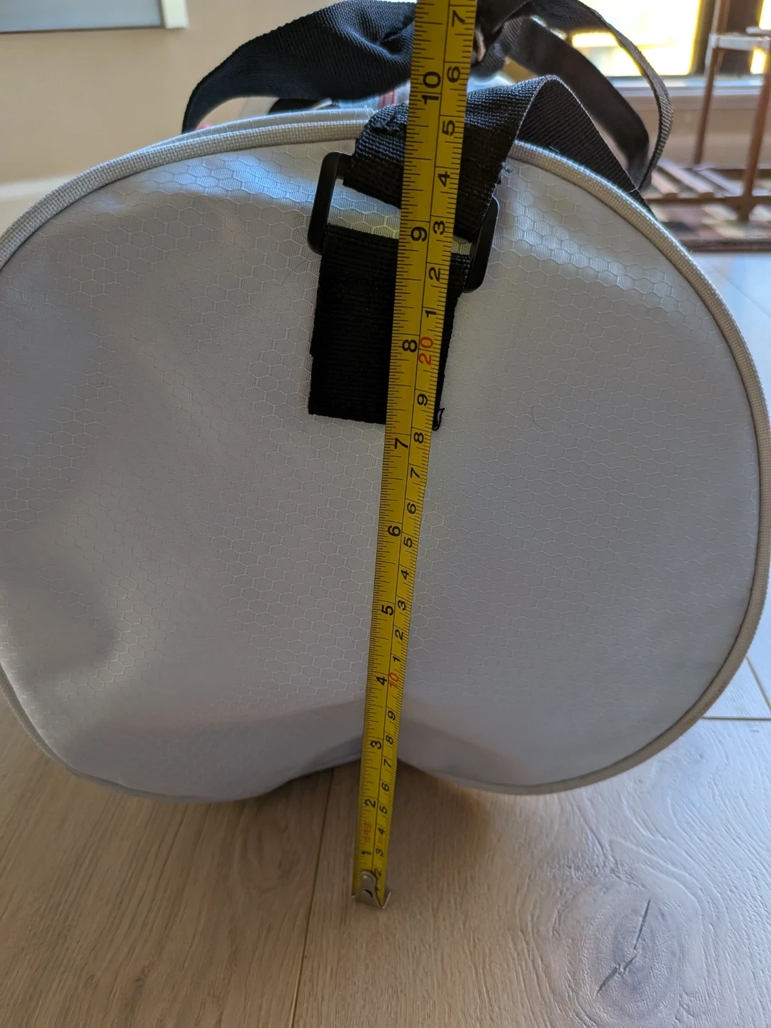 Add some colours to your workouts! Fell in love with this duffle bag but it's never quite fulfilled its gym potential - used it a handful of times for short trips but mainly to hold other bags. Measures approximately 10 inches in diameter and about 17.5" in width with one main compartment and a front compartment. Zippers all glide smoothly. Note some tugged threads/strings on the strap, some faded colours on the logo and a tiny yellow stain (see photos) but otherwise it's like new.