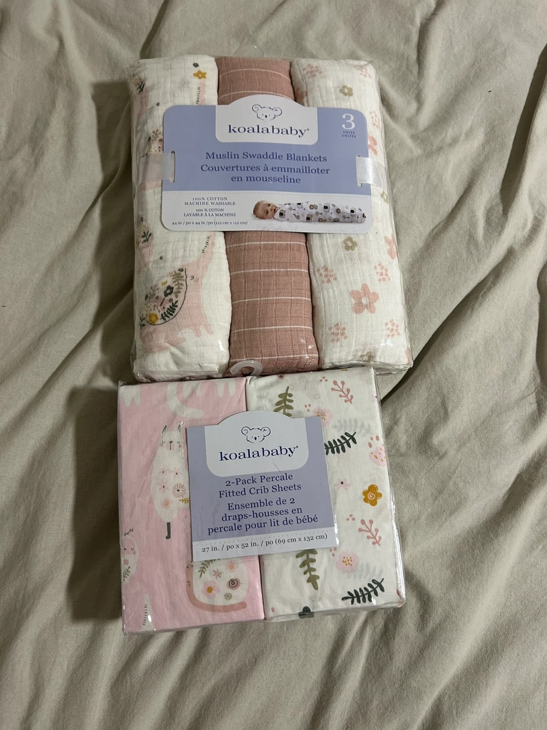 This Koala Baby set includes 3 muslin swaddle blankets and a 2-pack of fitted crib sheets. Blankets are 100% cotton and machine washable at 44 in. x 44 in. Crib sheets are percale and measure 27 in. x 52 in.