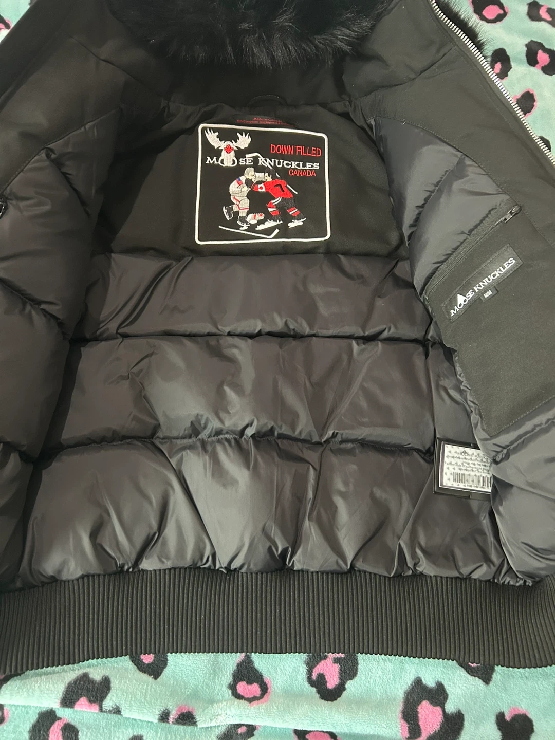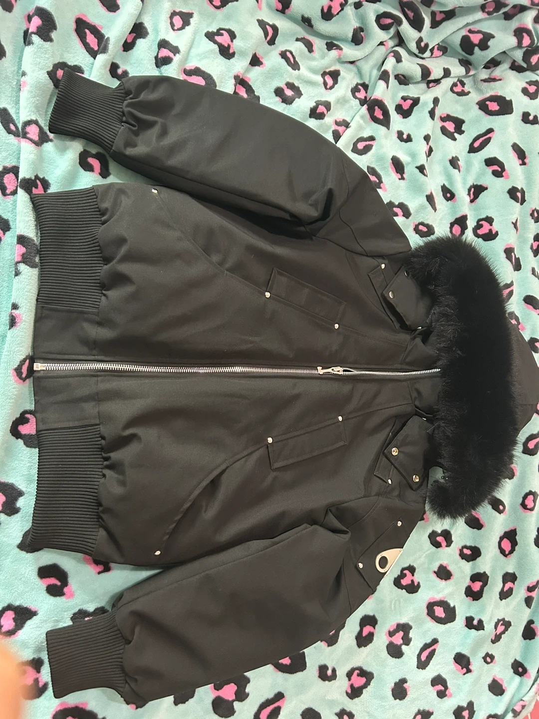 Selling a stylish black Moose Knuckles bomber jacket! It's in great condition and perfect for staying warm. The jacket features the iconic Moose Knuckles logo and a fur-trimmed hood.