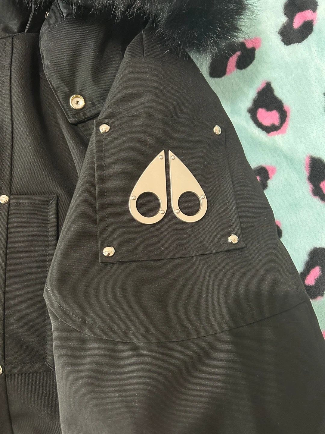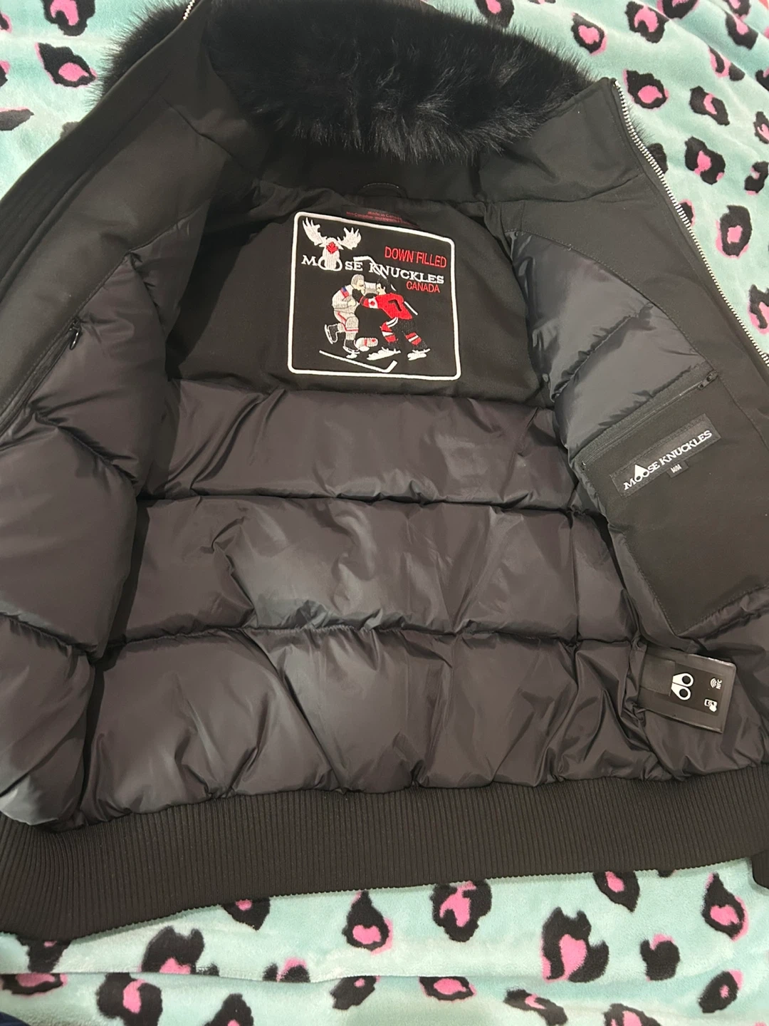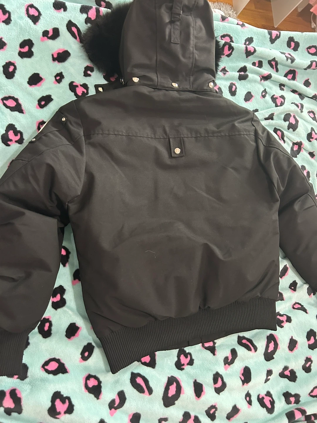 Selling a stylish black Moose Knuckles bomber jacket! It's in great condition and perfect for staying warm. The jacket features the iconic Moose Knuckles logo and a fur-trimmed hood.