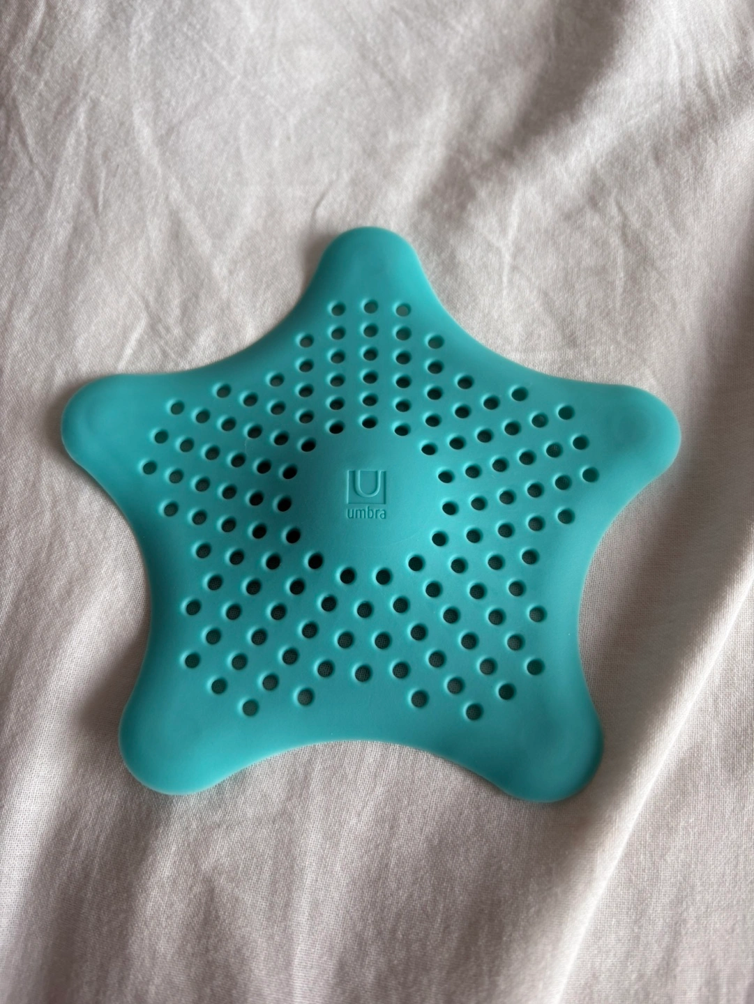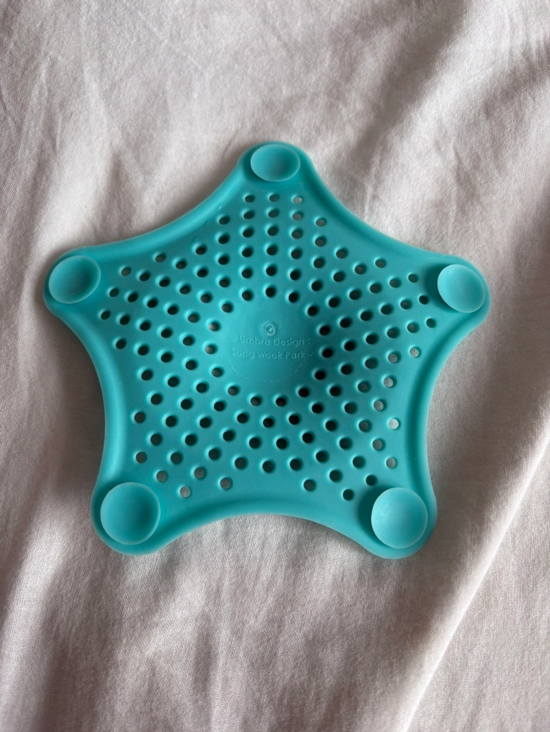 Cute starfish-shaped drain cover. Keeps hair and debris out of your drain. Made of flexible silicone. Light teal colour. Four suction cups on the bottom.