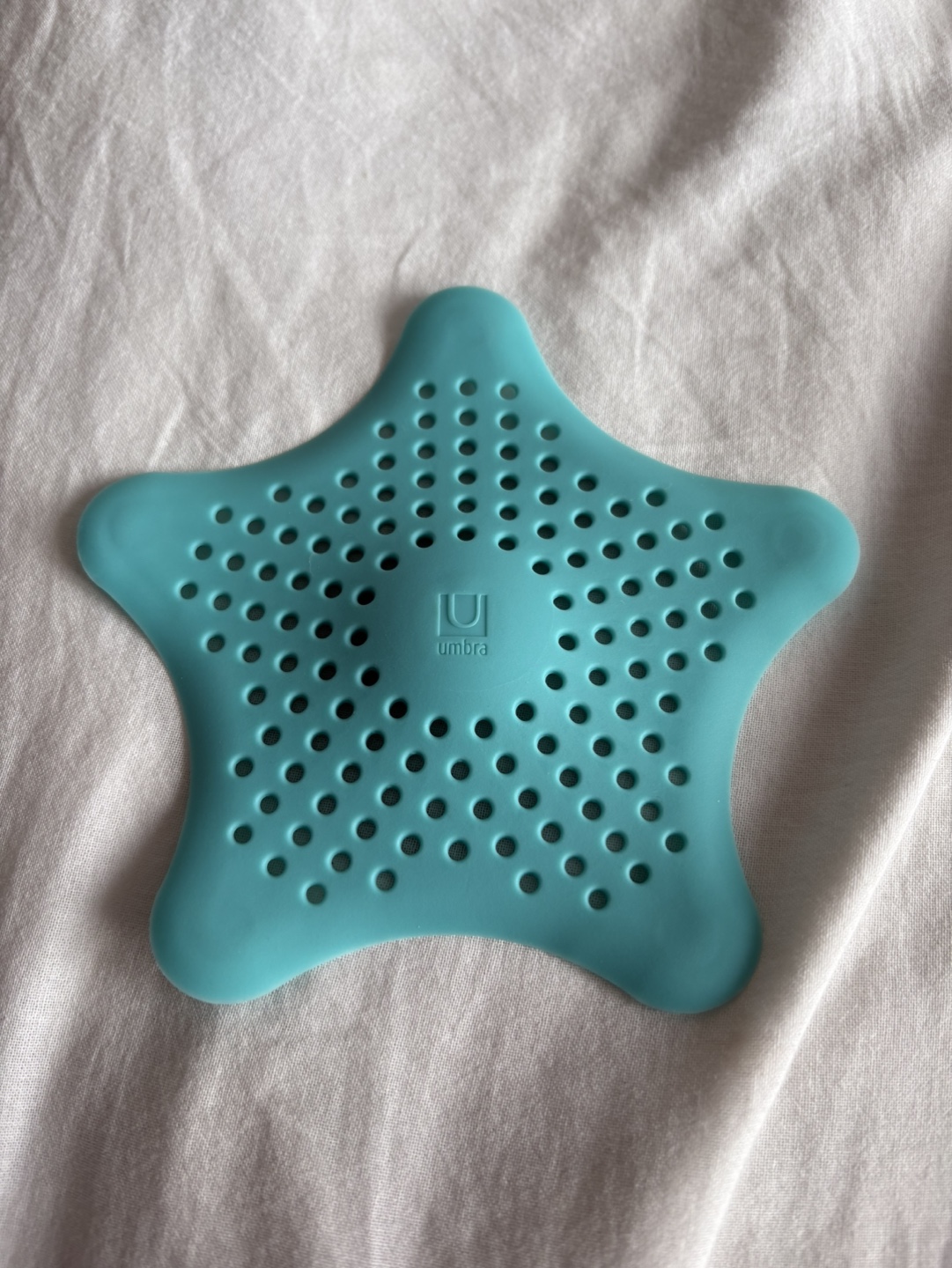 Cute starfish-shaped drain cover. Keeps hair and debris out of your drain. Made of flexible silicone. Light teal colour. Four suction cups on the bottom.