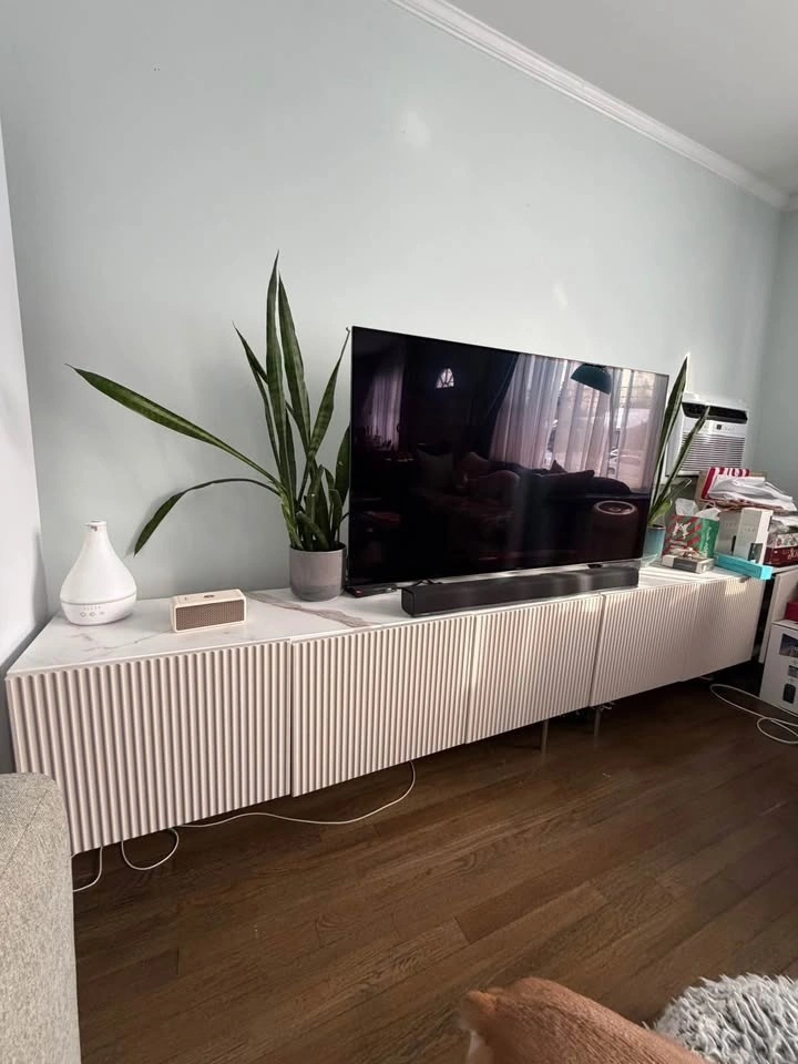 Selling two matching beige TV stands in excellent condition. Can be used together as one long console or separately. Fits TVs up to 65 inches. Clean, modern design, neutral beige color. Very sturdy and well maintained. Retail $439 each, selling for $275 each or $550 for the pair (preferred). Pickup only. Each console measures: Depth 14.6 in, Height 22.4 in, Width 59 in.