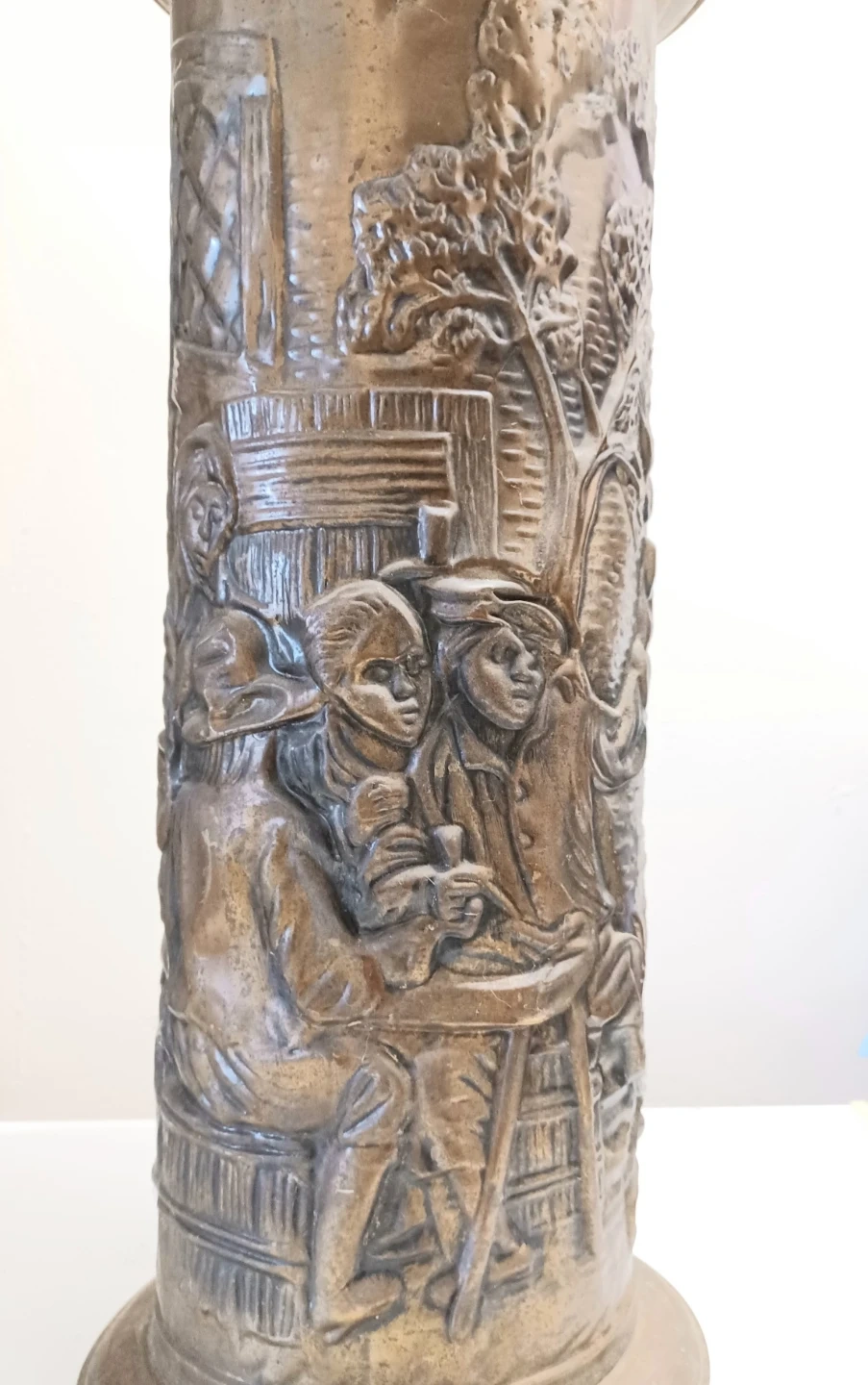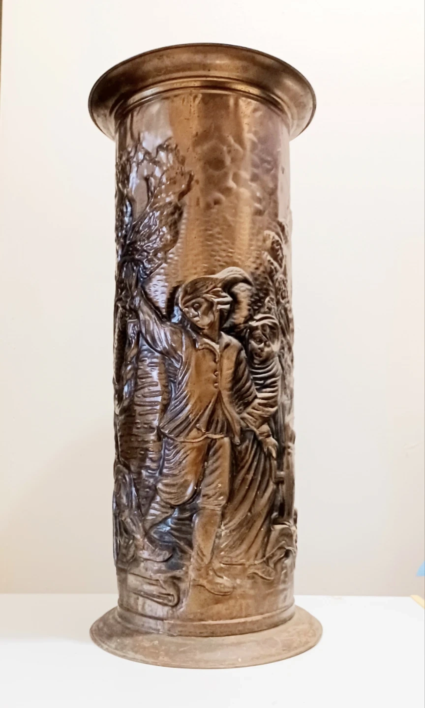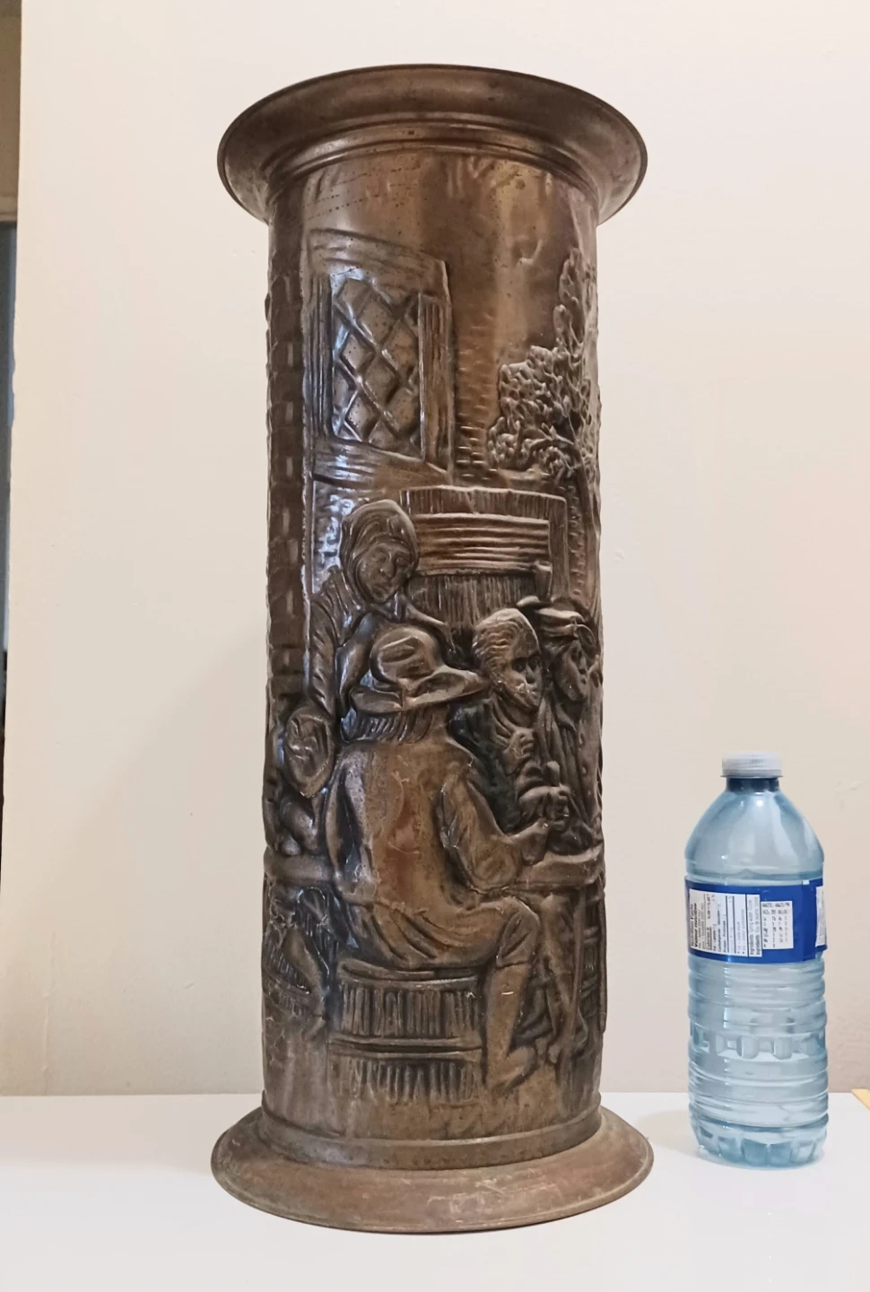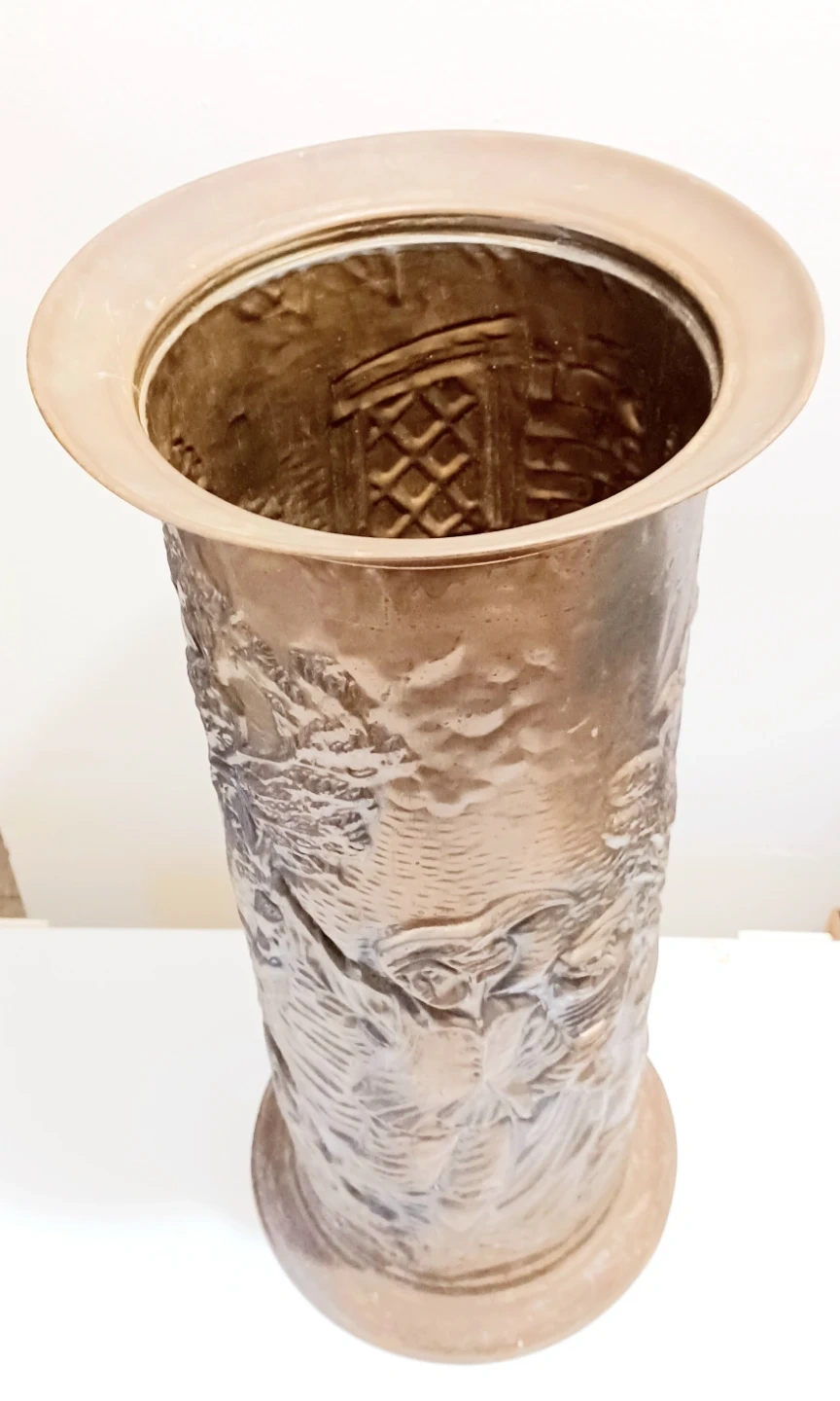 Vintage,Solid Construction English Embossed Brass Umbrella Stand or Cane Holder, featuring Traditional Scenes. Perfect for adding a touch of old-world charm to your entryway; it's in very good condition.