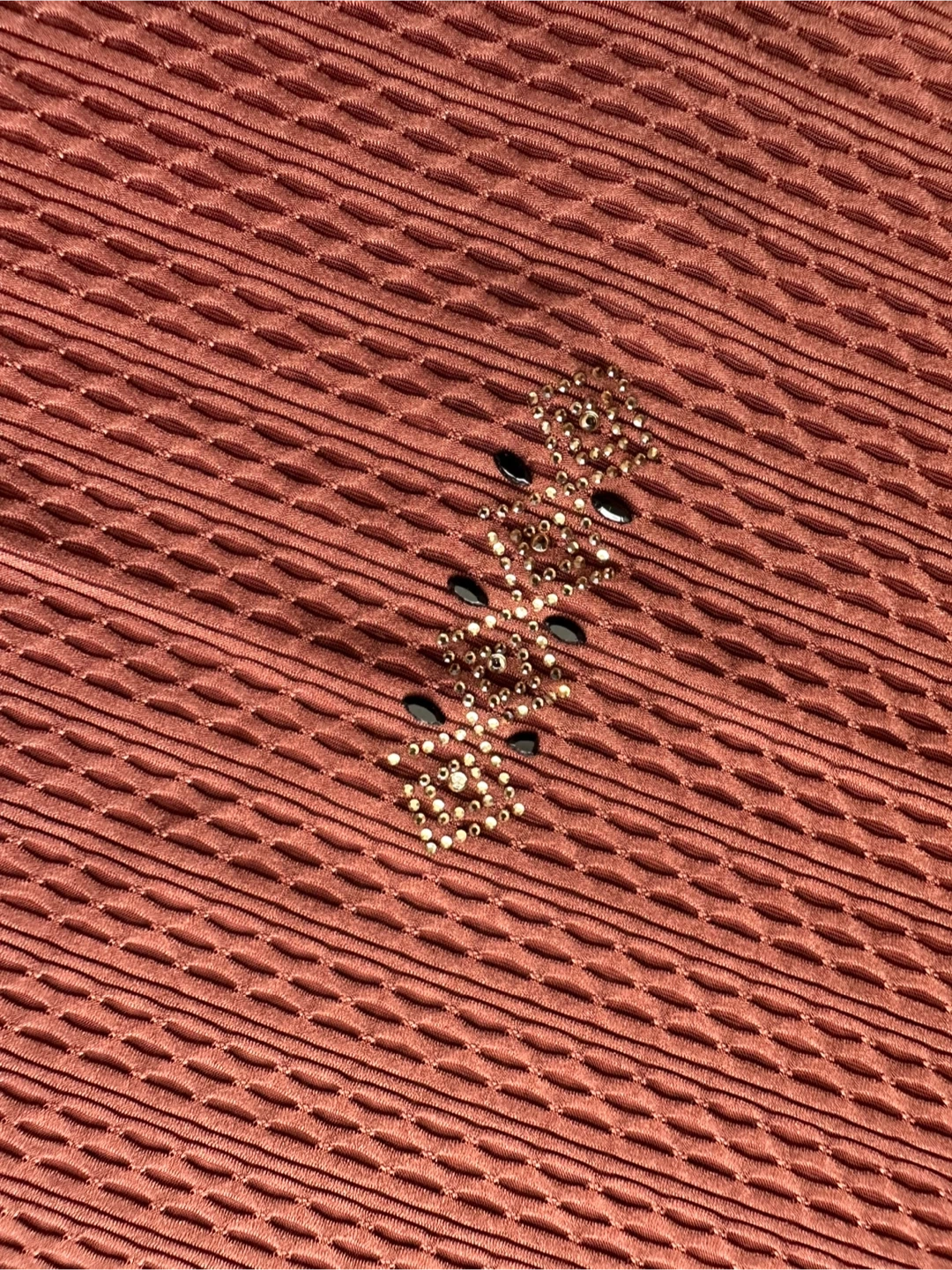 A brown textured scarf with beaded embellishments along one side. It has a woven pattern throughout the fabric. Perfect for adding a touch of sparkle to your outfit!