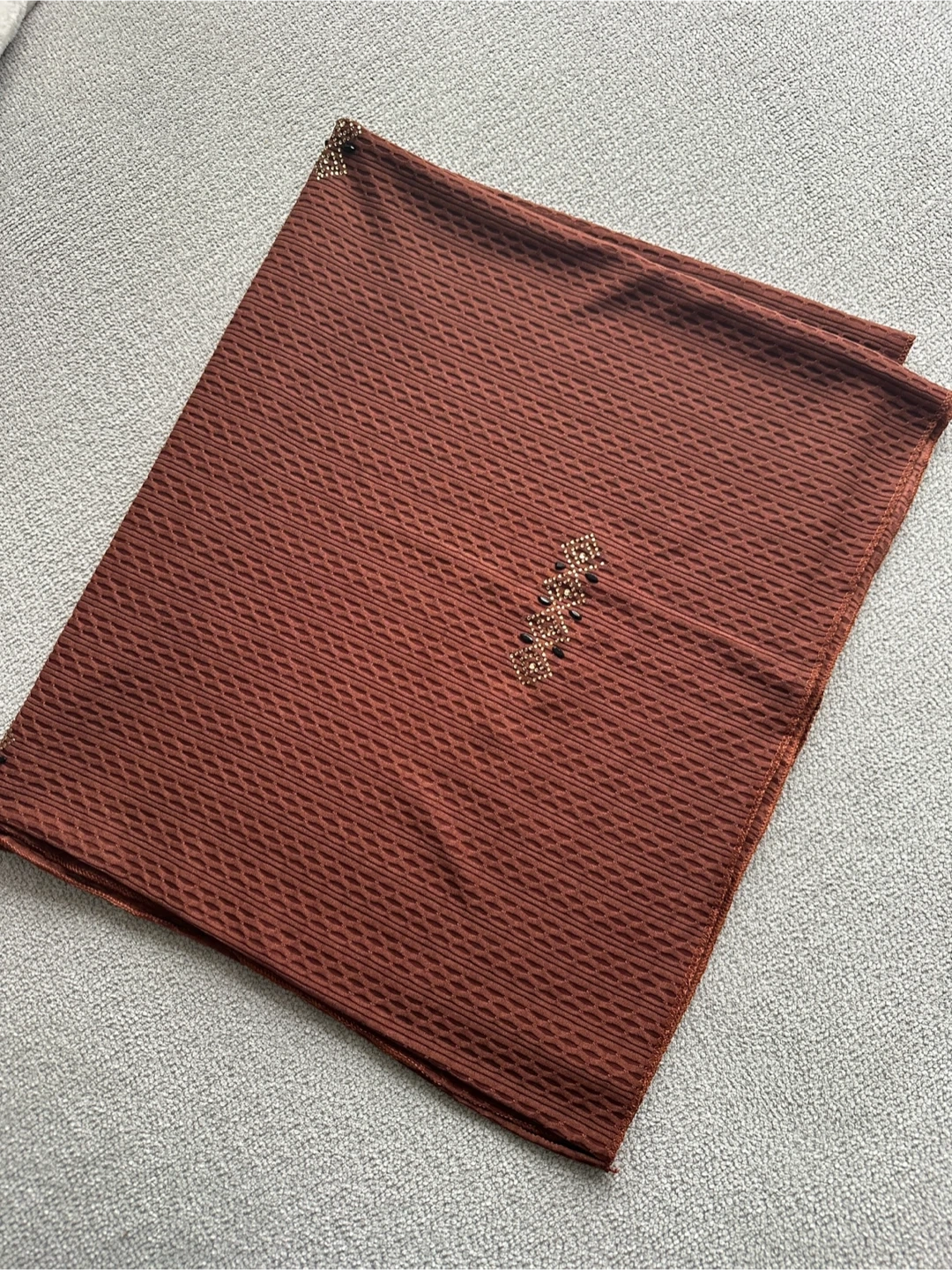 A brown textured scarf with beaded embellishments along one side. It has a woven pattern throughout the fabric. Perfect for adding a touch of sparkle to your outfit!
