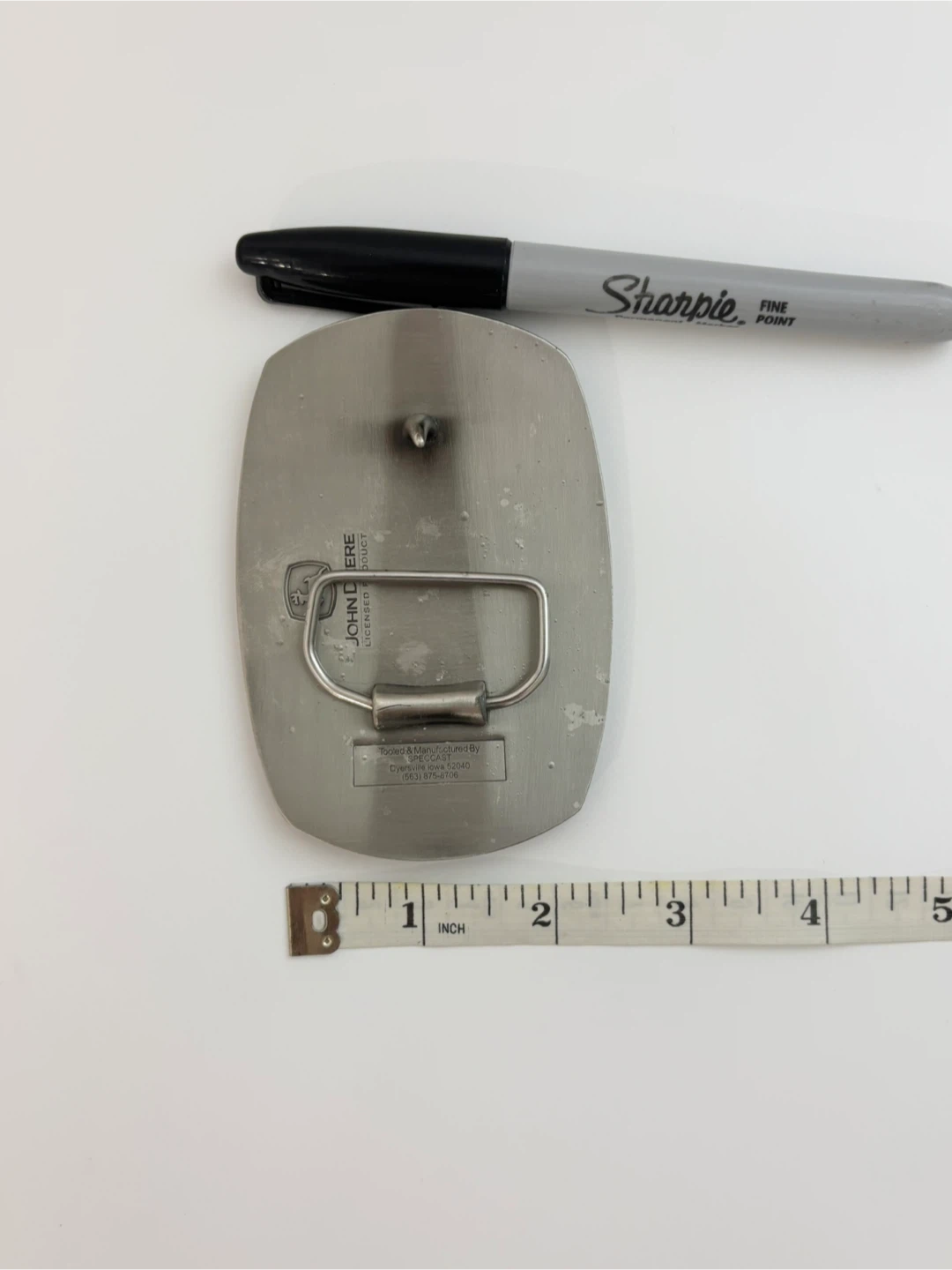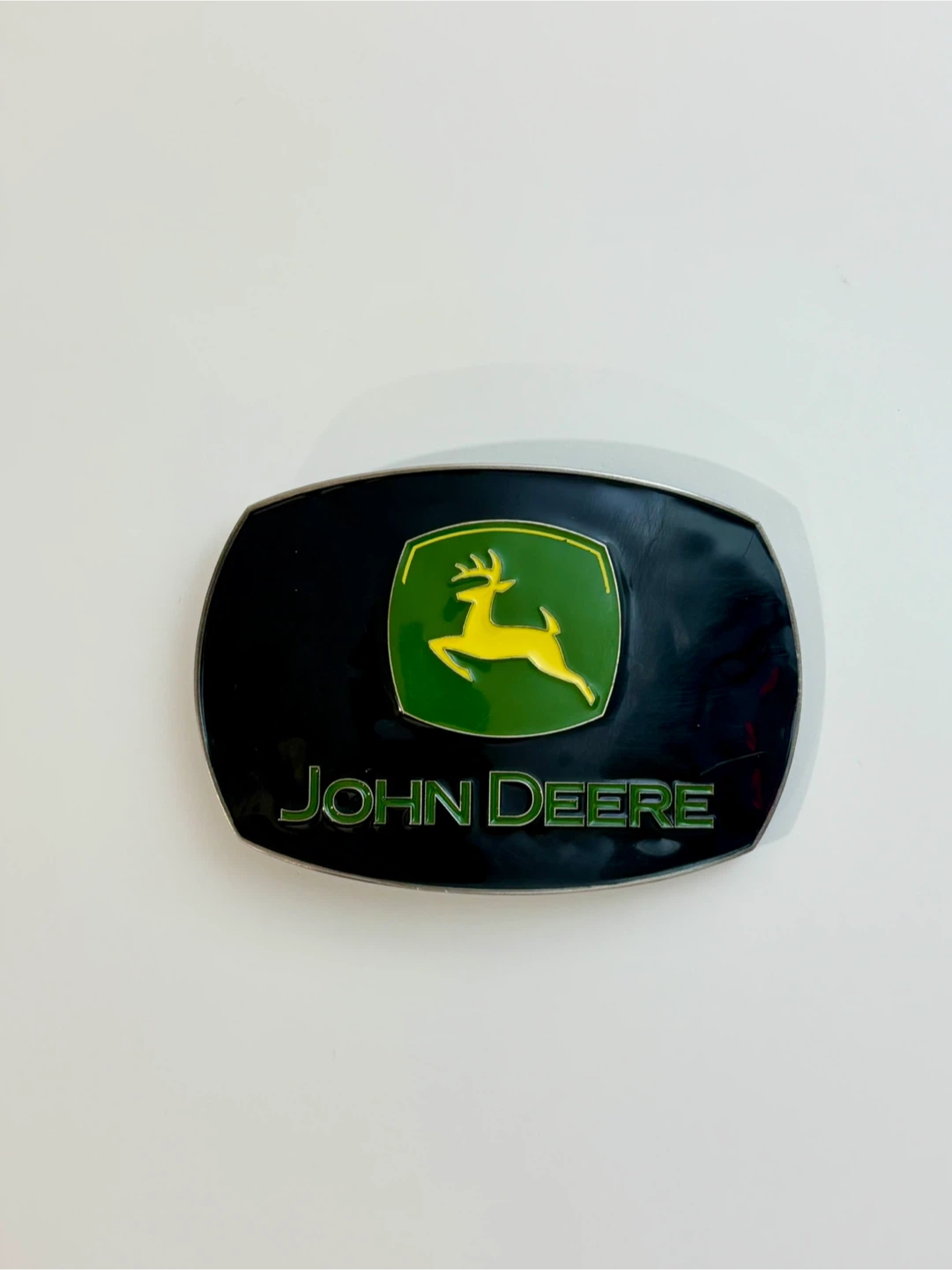 Features the classic John Deere logo with a deer and "JOHN DEERE" text. It's made of metal with a black enamel finish. Perfect for any John Deere enthusiast or collector!