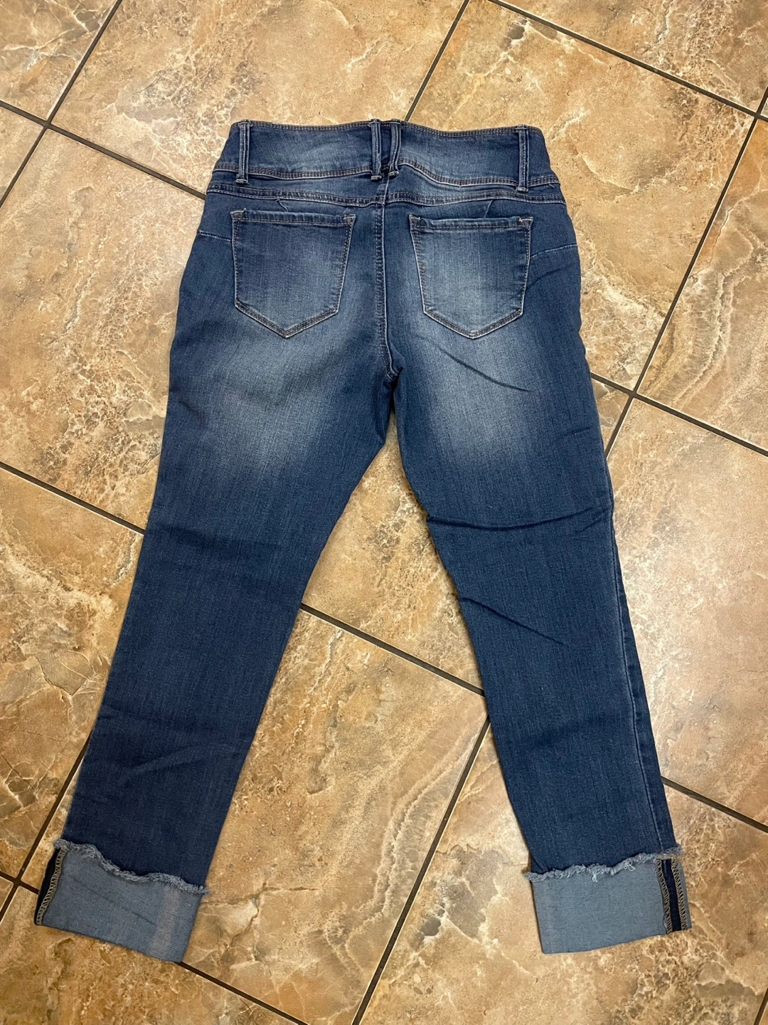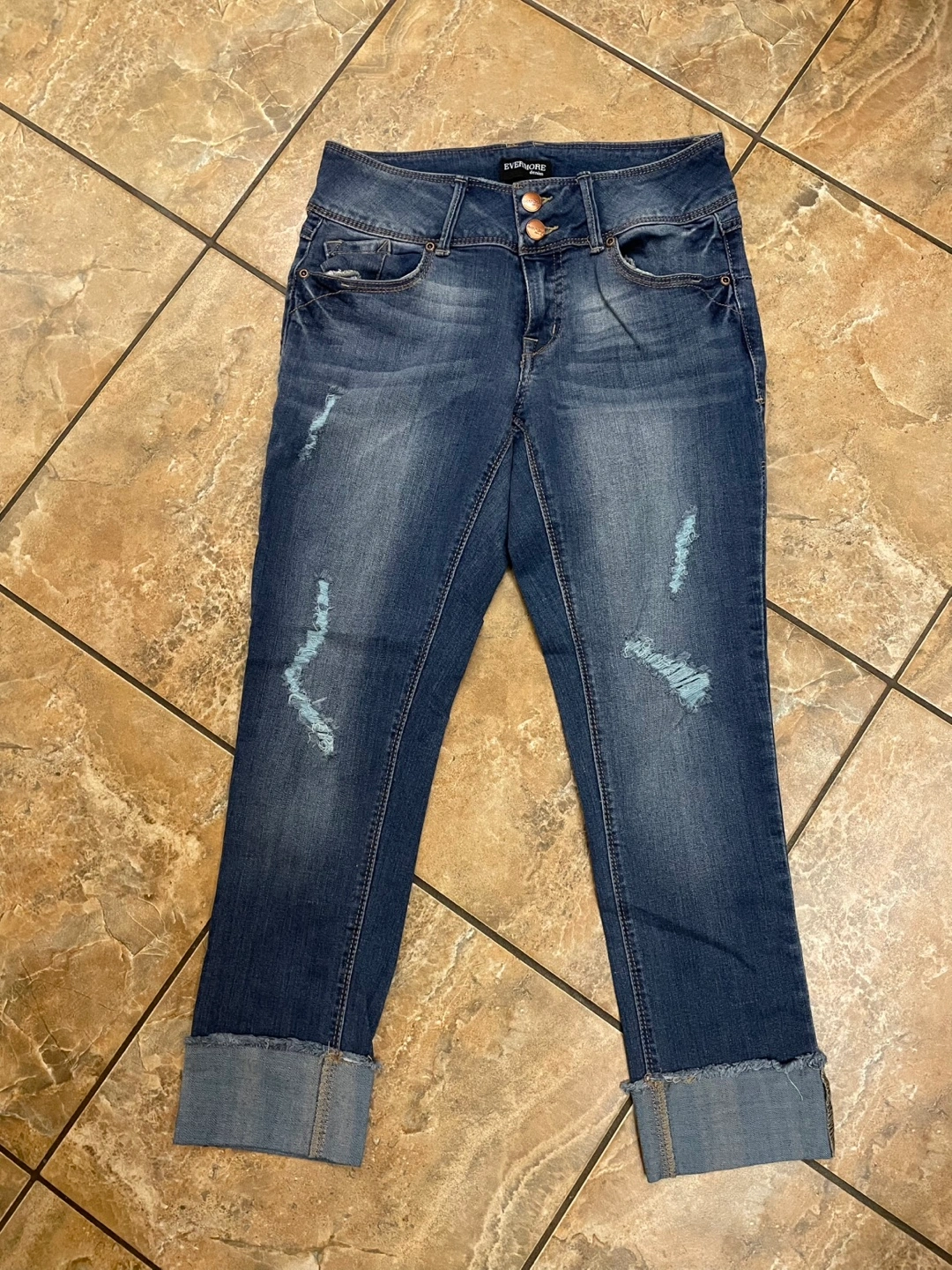 Evermore distressed denim jeans with 3/4 cuffed hems.