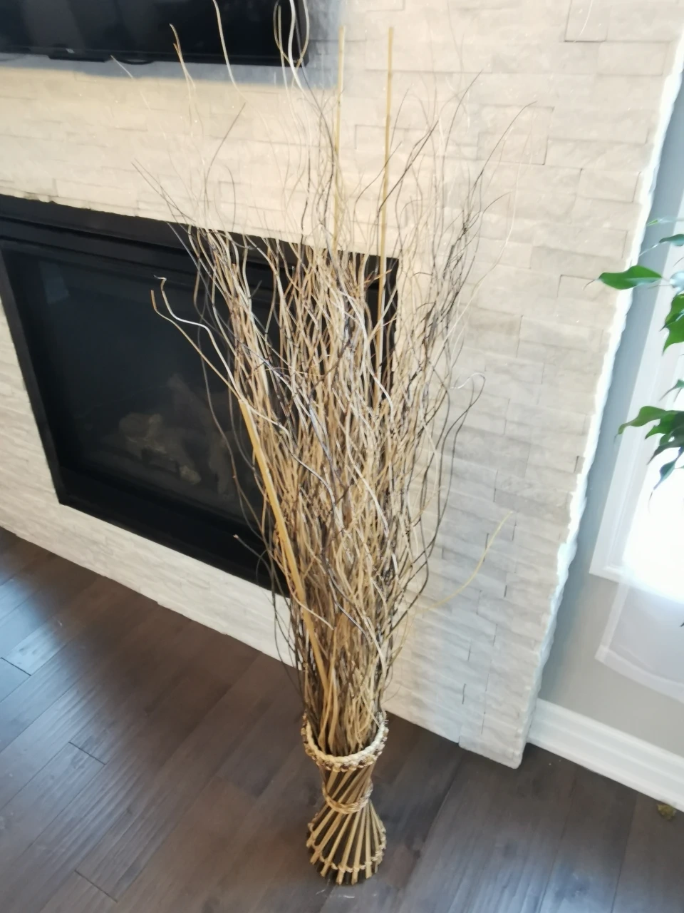 Adds a natural, rustic touch to any room. This bundle features dried branches secured in a woven basket base. It's perfect for enhancing your home decor. The branches are varied in thickness and natural tones.