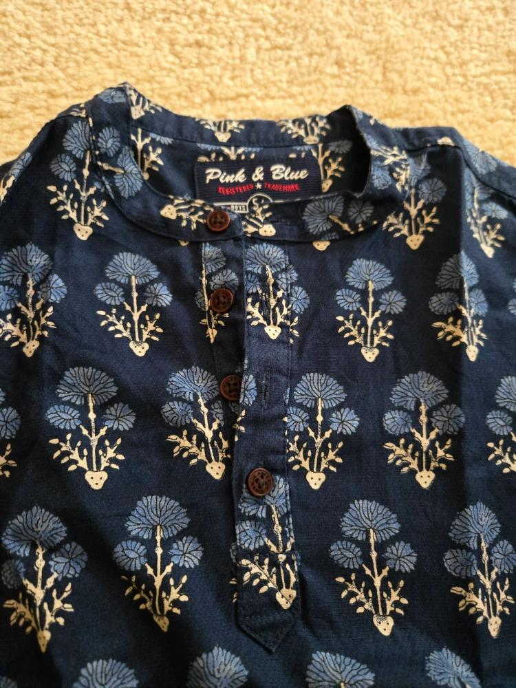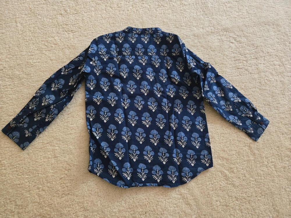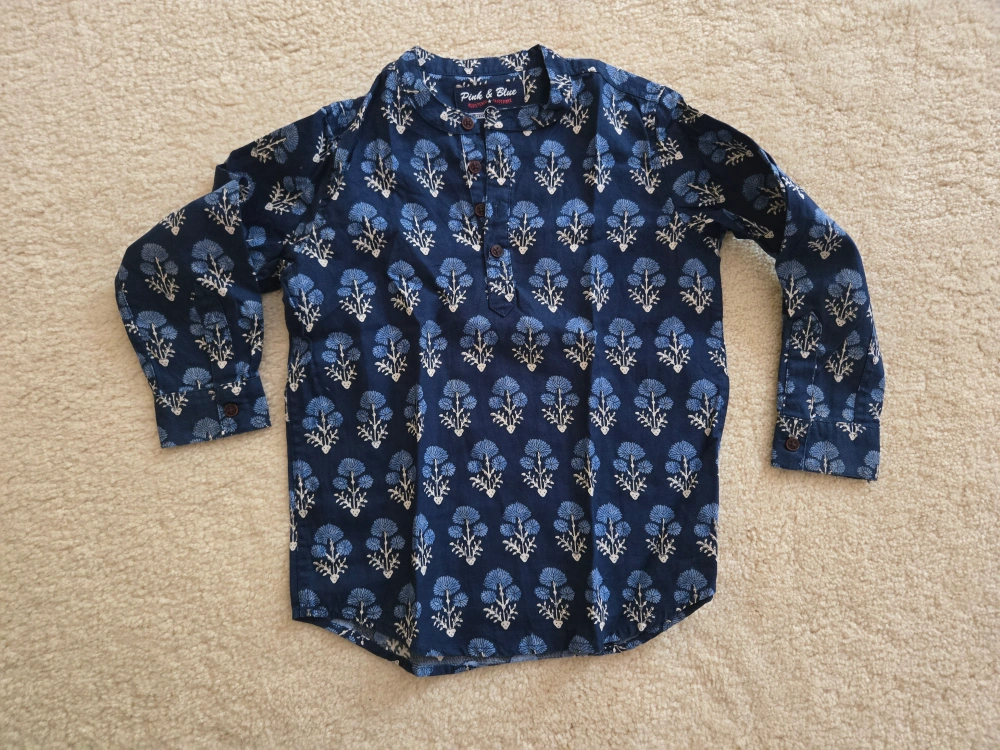 This is a cute boys cotton short kurta/ shirt in size 5/6 years. It features a stylish blue floral print and is in great condition. Perfect for your little one!