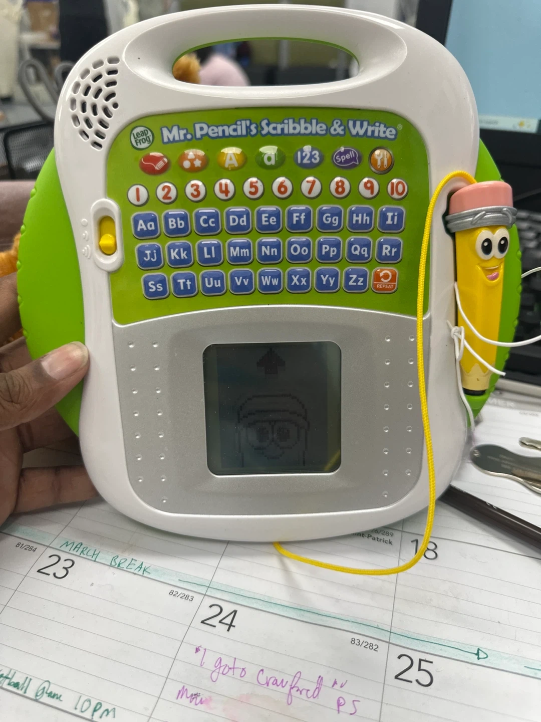 LeapFrog Mr. Pencil's Scribble & Write learning toy. Features ABCs, numbers, and drawing capabilities. Includes stylus attached by cord.