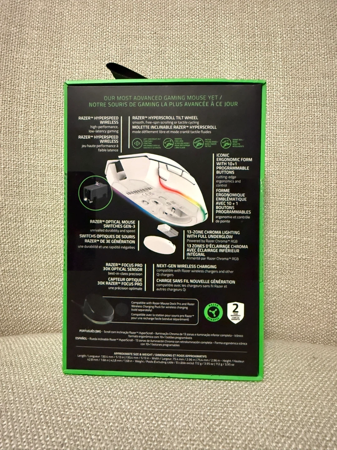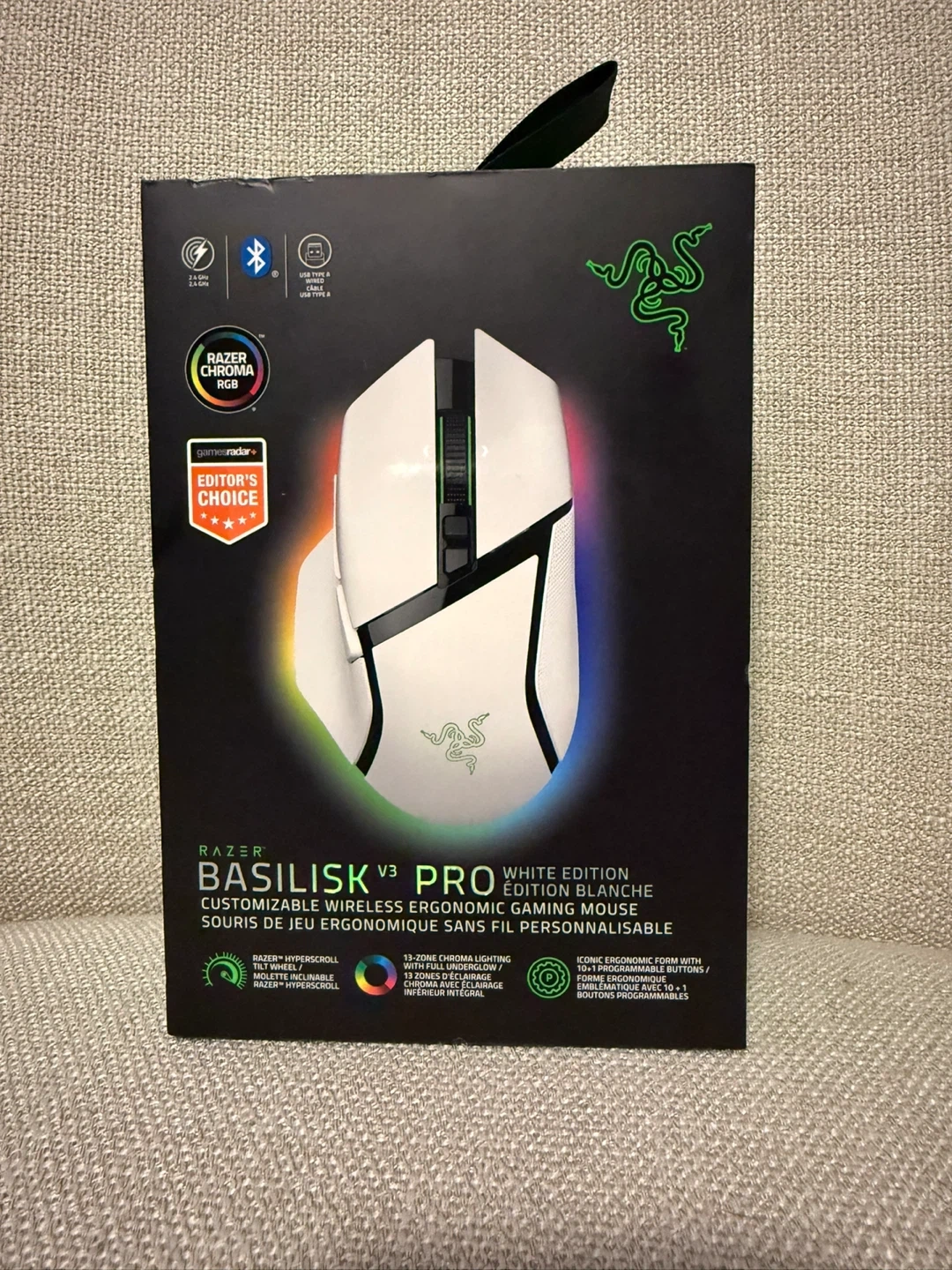 Selling a Razer Basilisk V3 Pro. It is a customizable wireless ergonomic gaming mouse in a white edition. It features Razer Hyperscroll tilt wheel, optical mouse switches Gen 3, and 13-zone Chroma RGB lighting. It offers 3 modes of connection: Hyperspeed Wireless, Bluetooth, and USB Wired. It’s brand new still sealed in the box and has never been opened used or taken out of the box.