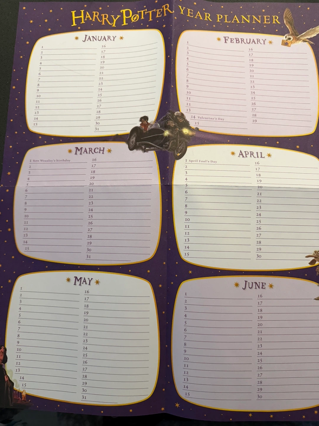 Keep track of your important dates with this Harry Potter themed year planner. It covers all 12 months of the year, from January to December. Important Harry Potter birthdays and events are already noted!