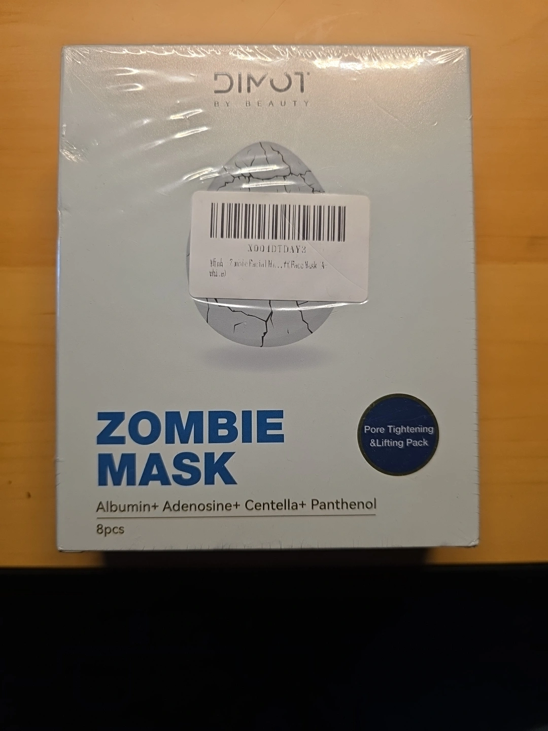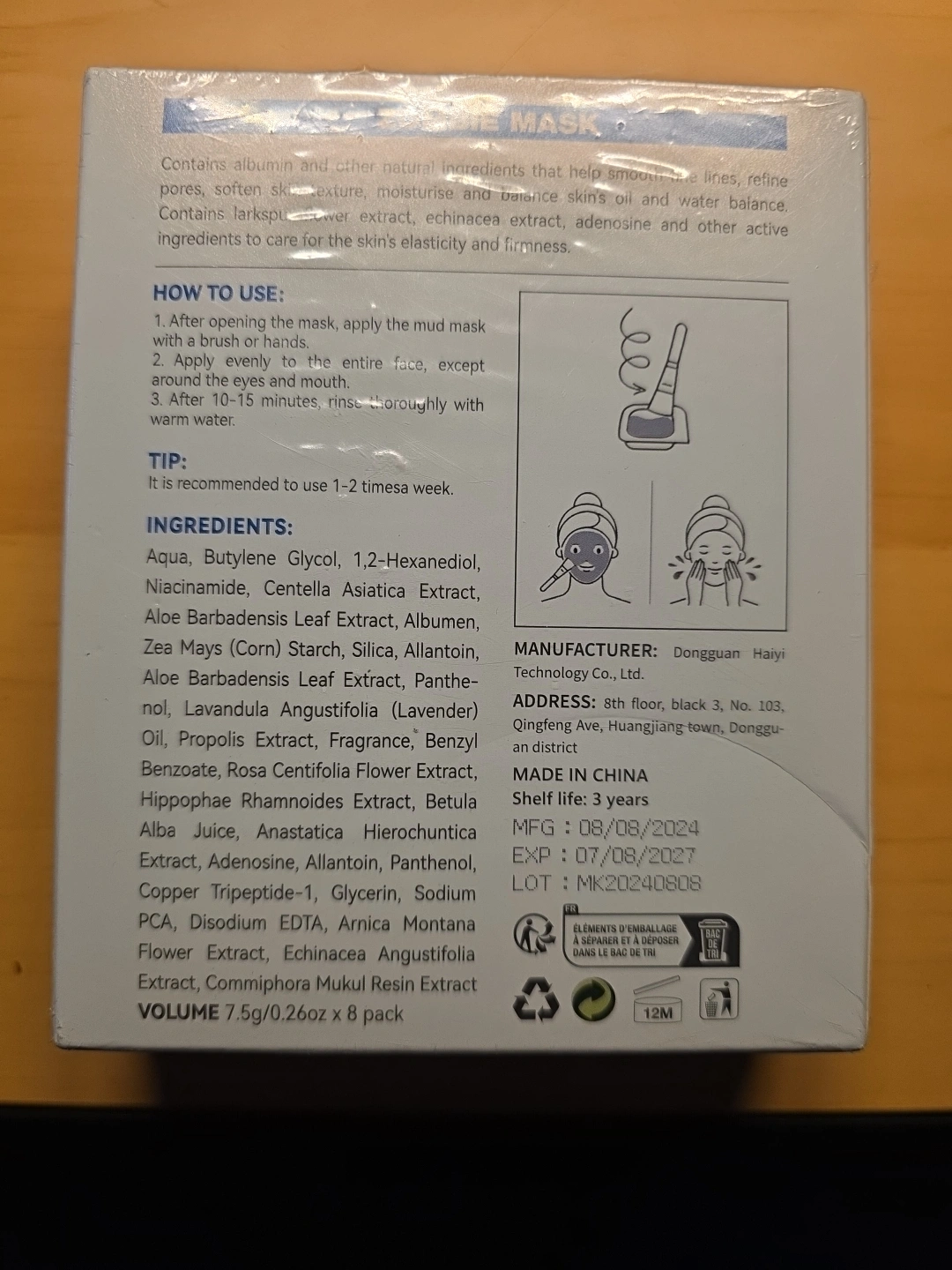 It will help you relax. The box is sealed. It includes eight masks. It says the mask will provide pore tightening and lifting. The ingredients include albumin and other natural ingredients.