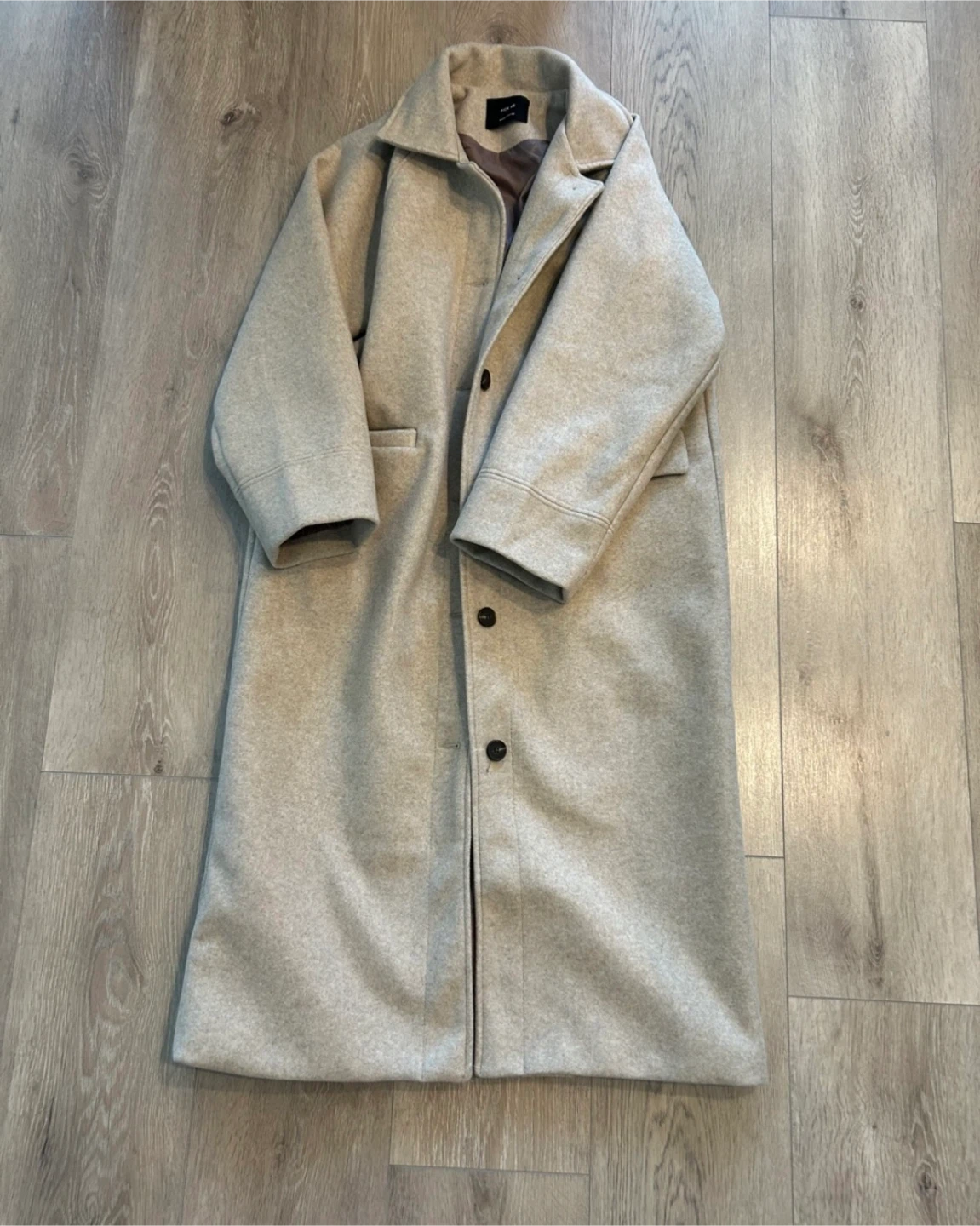 A stylish beige long coat, perfect for layering during the cooler months! It features a classic design with buttons and a comfortable fit. It's in great condition and ready for a new home