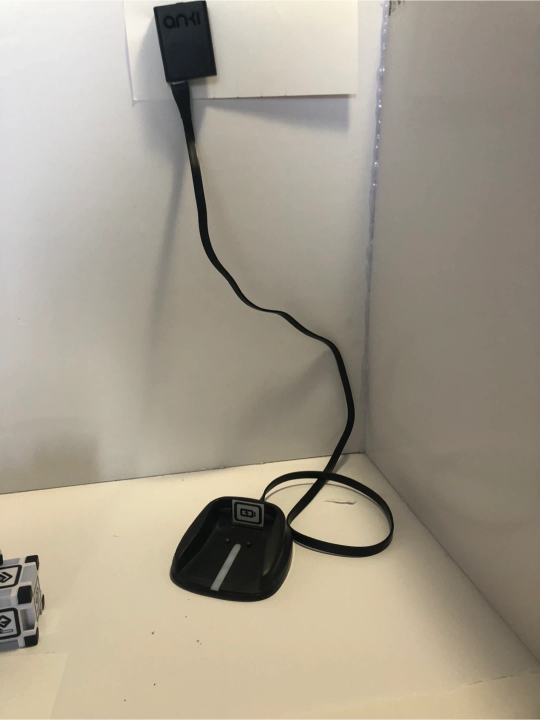 This is an Anki Cozmo robot. It comes with a charging dock and three smart cubes. It's a fun little robot for interactive play!