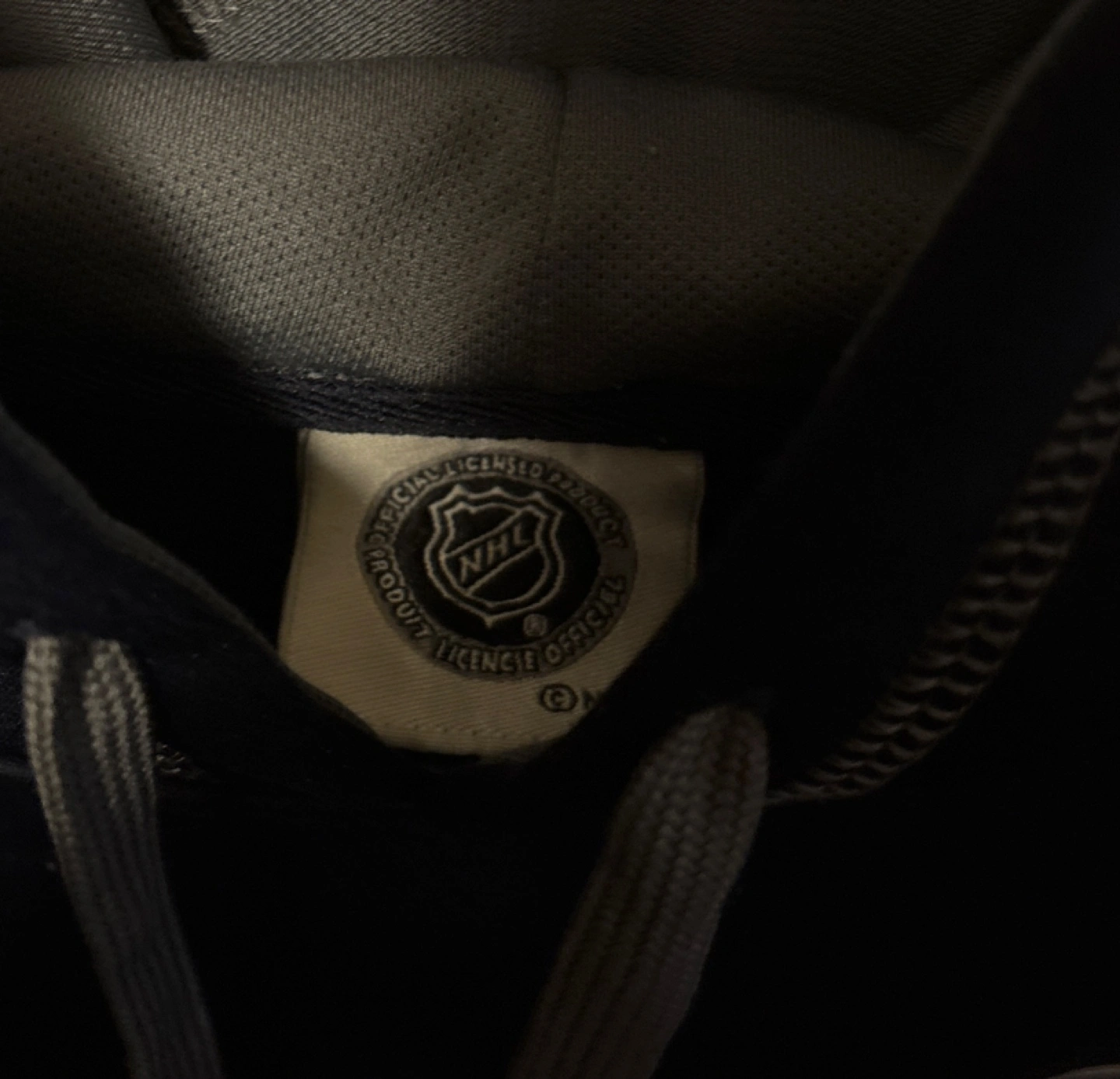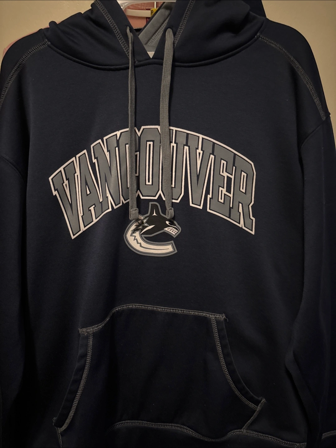 Men's navy blue Canucks hoodie. Features team logo and lettering. Grey drawstrings and inner lining. Officially licensed NHL product.