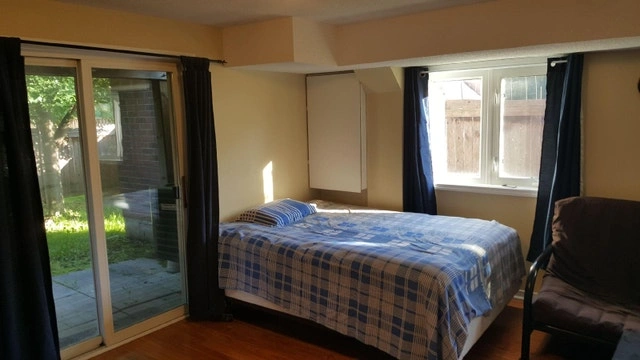 Walkout basement with ample sunlight and backyard available for rent. Ideal for a single young professional or a young couple. This is an end unit townhouse in a kid-friendly and safe community. Located 10 minutes walking distance to Cooksville GO station in Mississauga, 2 minutes to major bus routes, and close to grocery stores, major hospitals, parks, and schools (Postal code: L5B1V7). Closest intersection - 1-minute walk: Confederation and Hillcrest. Rent is $1,400 per month, including unlimited high-speed internet and all utilities. Basic furnishing (queen bed, sofa, closet, chairs, and center table) is included. Washer and dryer will be shared on weekends. We are a loving and caring family and looking to host like-minded individuals. P.S. – This house has been lucky for previous residents! Air conditioning, heat, water, hydro, fridge/freezer, and 1 parking spot included. 700 sqft. Month-to-month agreement. For rent by owner.