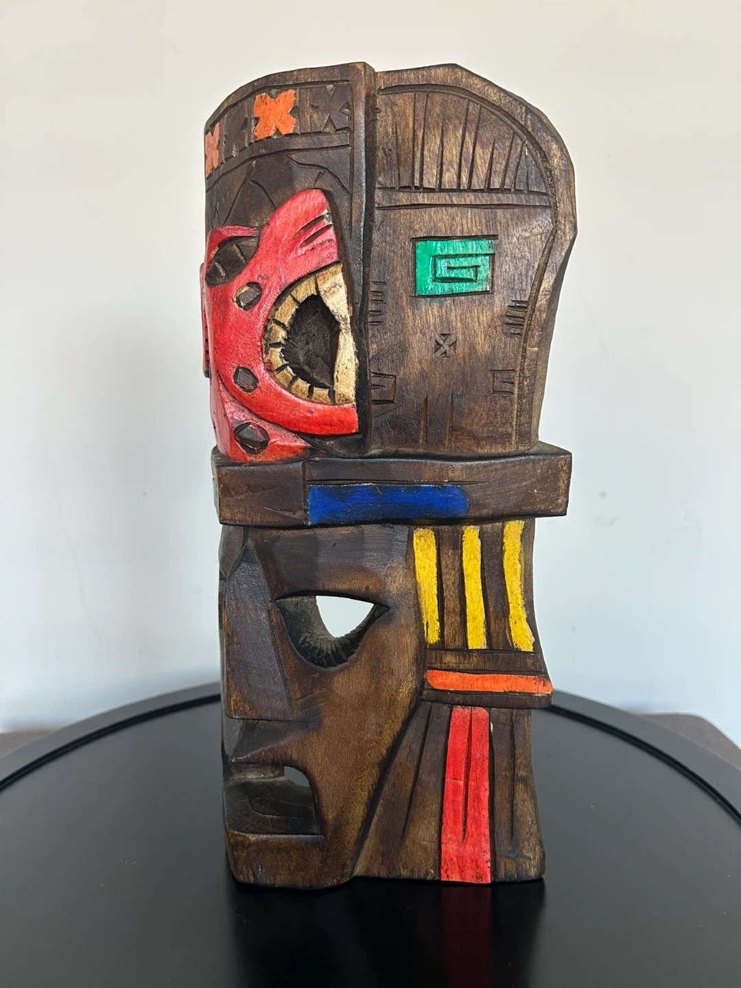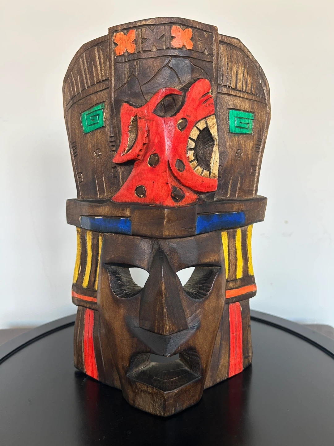 Vibrant vintage Mexican folk art mask, hand-carved with traditional Mesoamerican motifs. This striking piece features a tiered headdress with a red jaguar or serpent emblem, accented by geometric carvings and colorful hand-painted details in red, yellow, green, and blue.