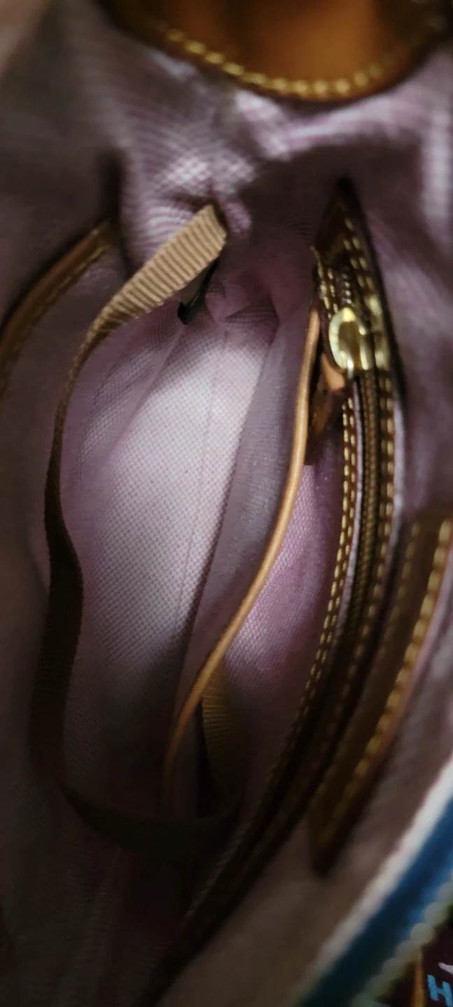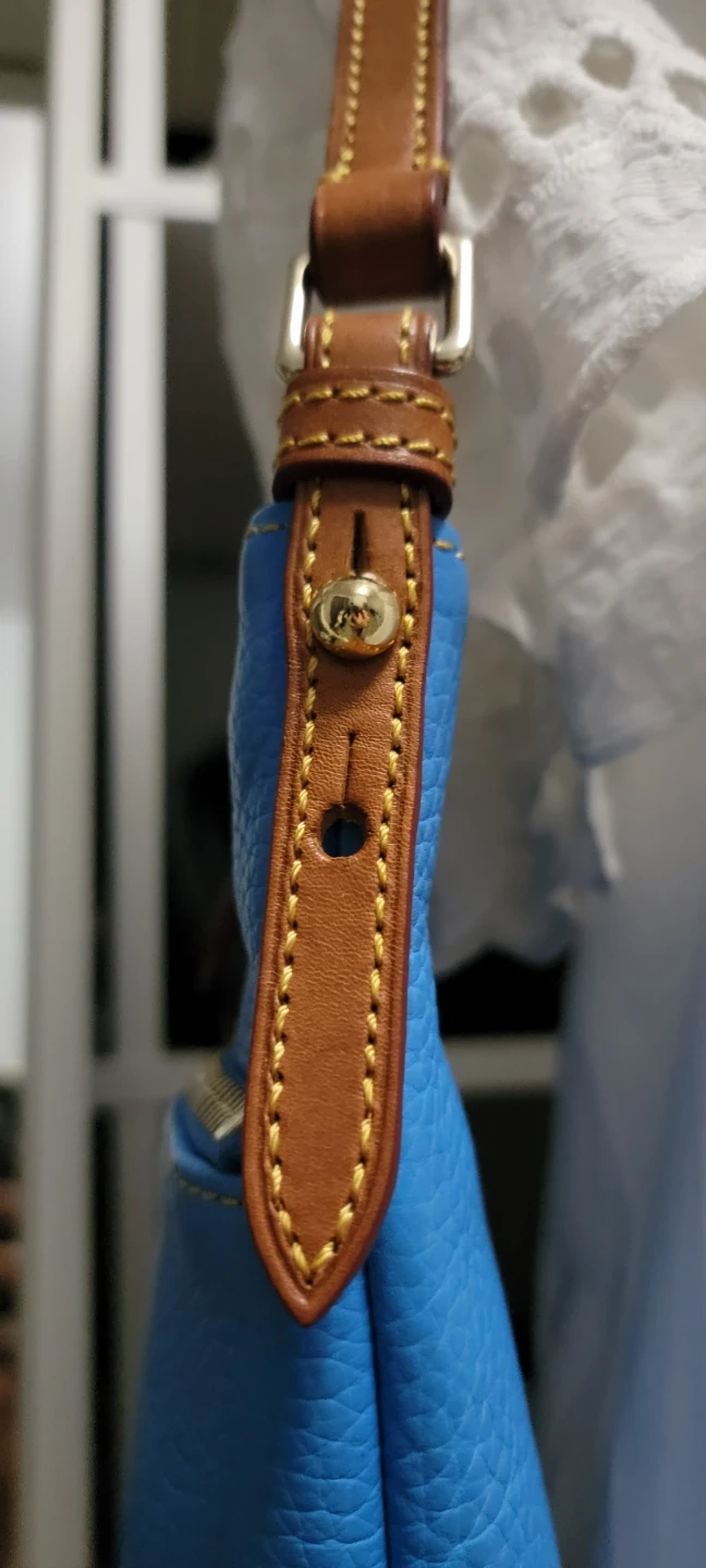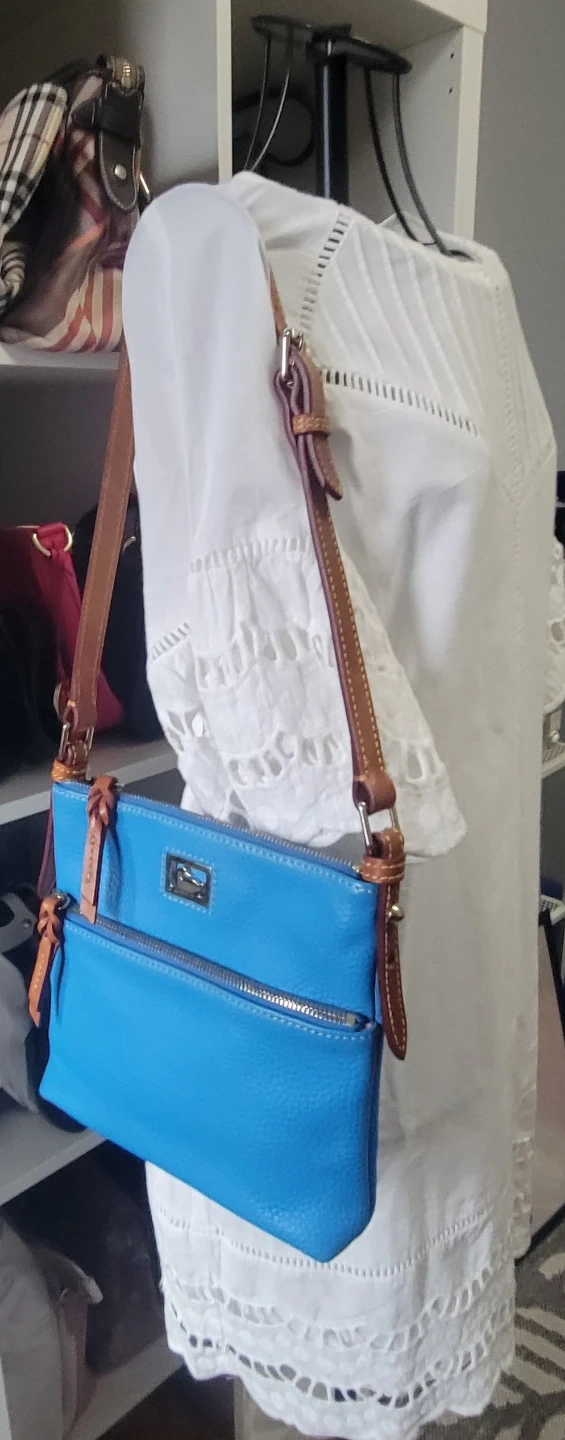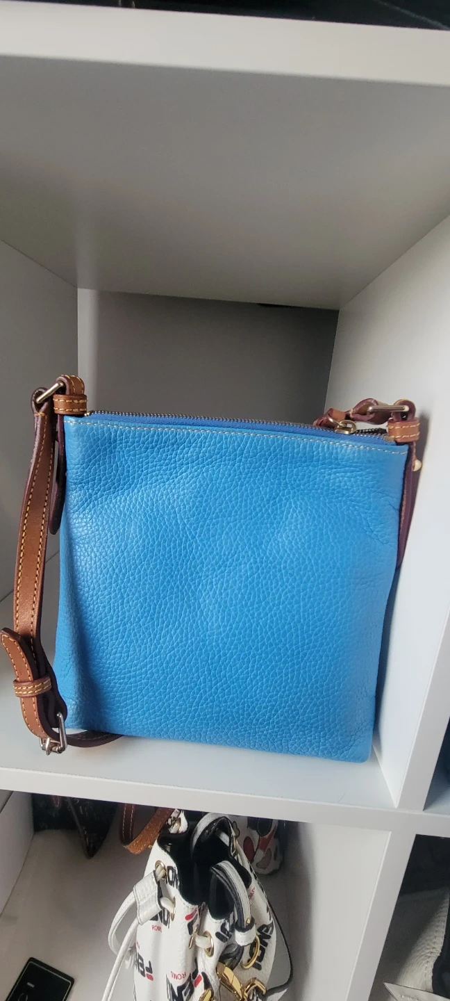 This is a blue pebbled leather shoulder bag from Dooney & Bourke. It has brown leather strap accents and silver-toned zippers. The bag has a main zippered compartment and a front zippered pocket.