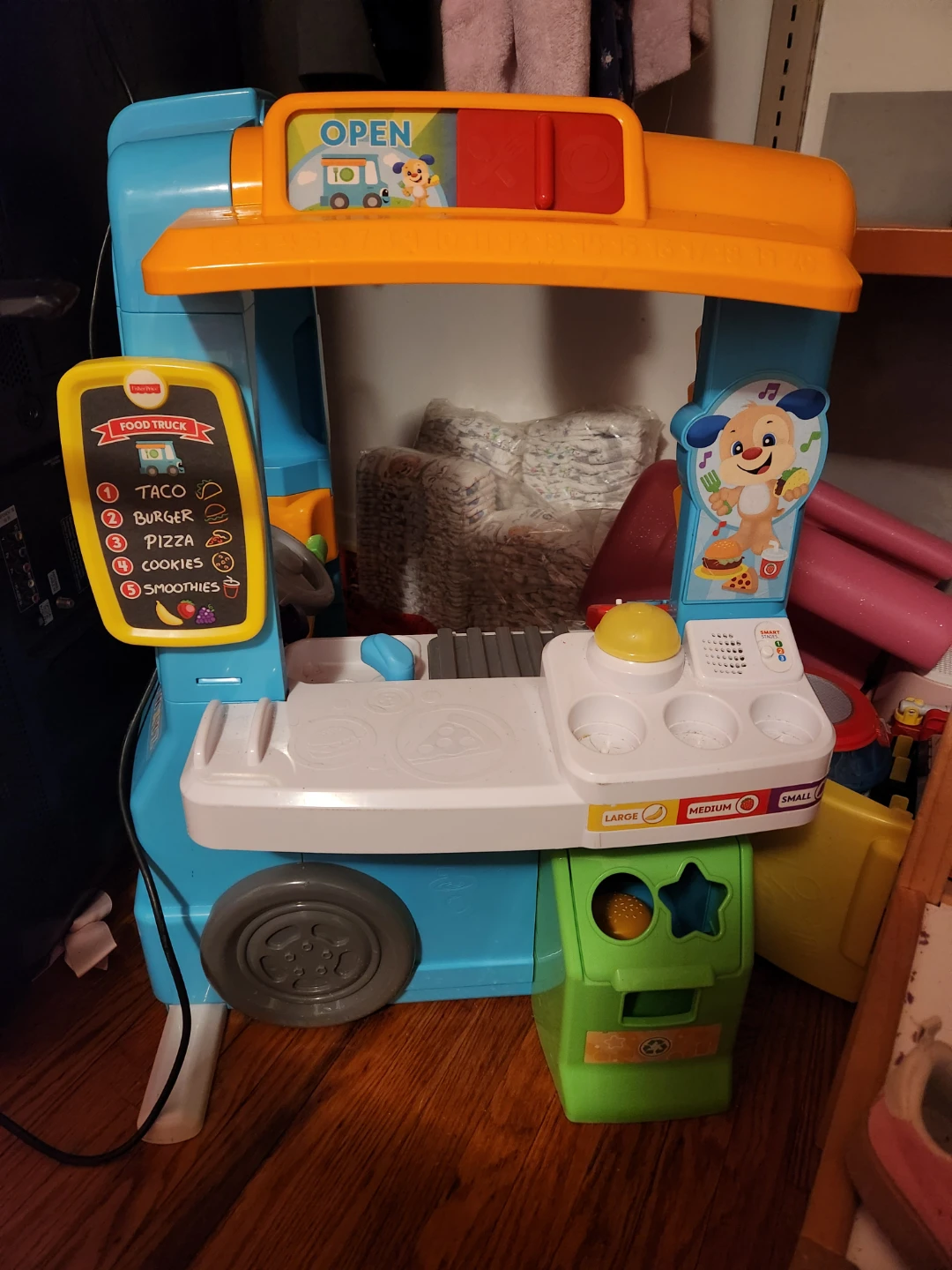 Selling a Fisher-Price food truck toy! It's in great shape and ready for a new little chef. The truck features an 'Open' sign and a menu with taco, burger, pizza, cookies, and smoothie options. There are also size options for large, medium, and small.