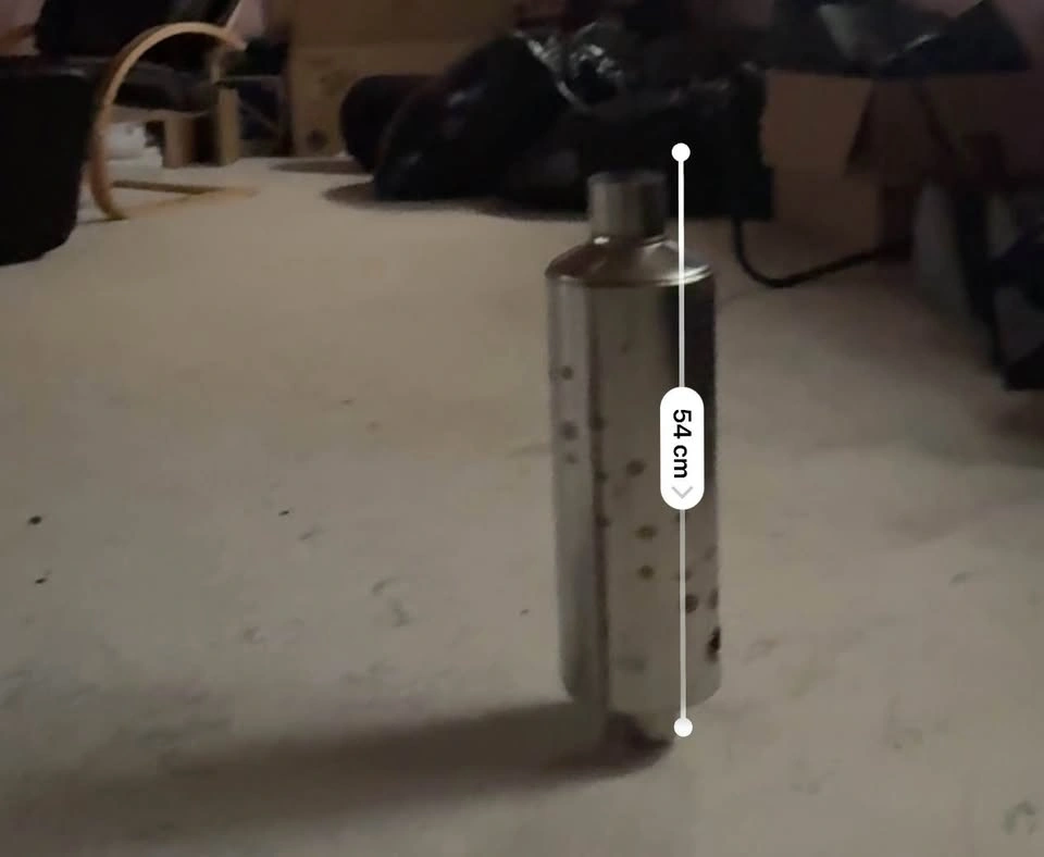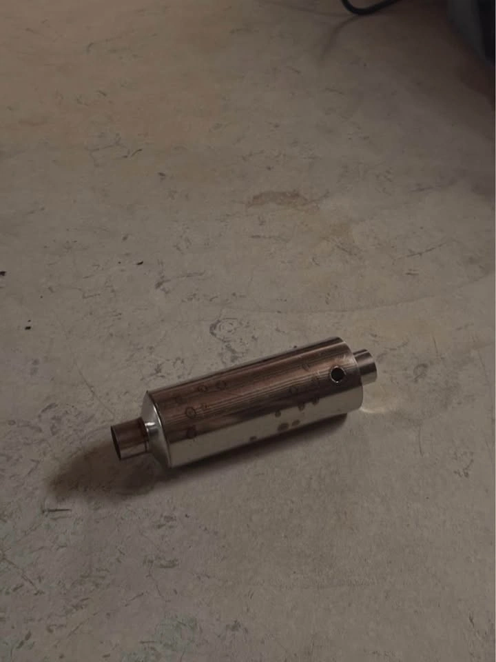 Universal stainless steel mini muffler / exhaust resonator in good condition. Solid metal construction, clean inside and out, no cracks or damage. Universal fit (custom/exhaust shop install recommended). Ideal as a resonator or sound modifier.