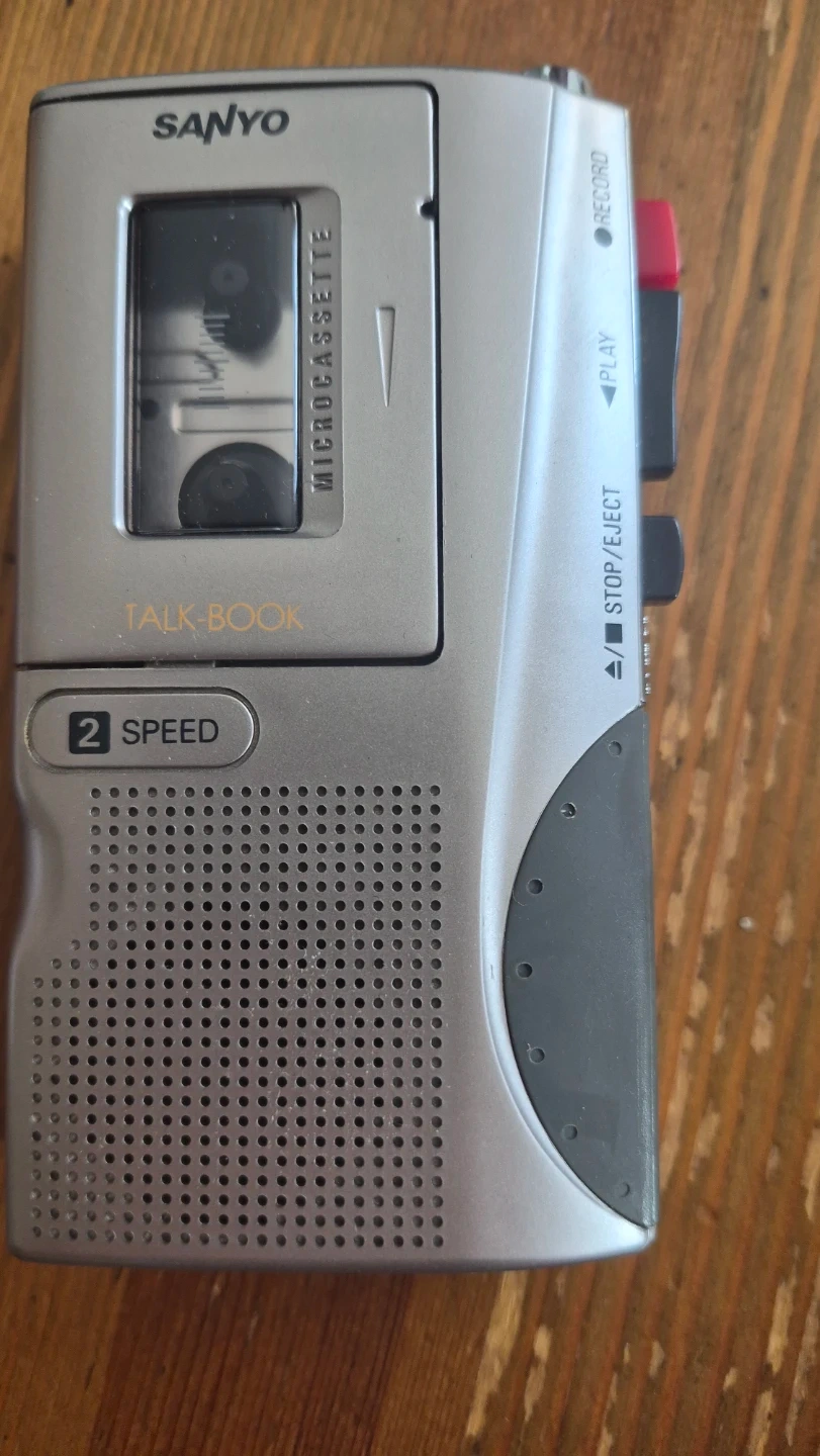 Selling a working vintage Sanyo Talk-Book microcassette recorder. It has two speeds and takes AA batteries. Model number is TRC-530M.