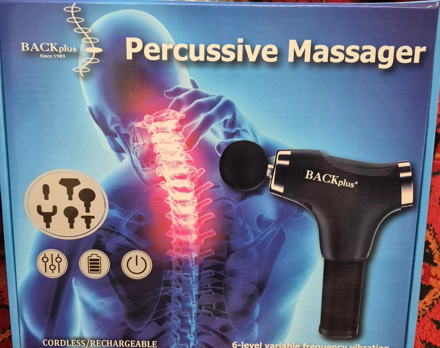 Brand New!! BACKplus percussive massager aids in relieving muscle and soreness. It's cordless and rechargeable with 6-level variable frequency vibration. Helps to ease muscle fatigue and promote recovery of soft tissue.