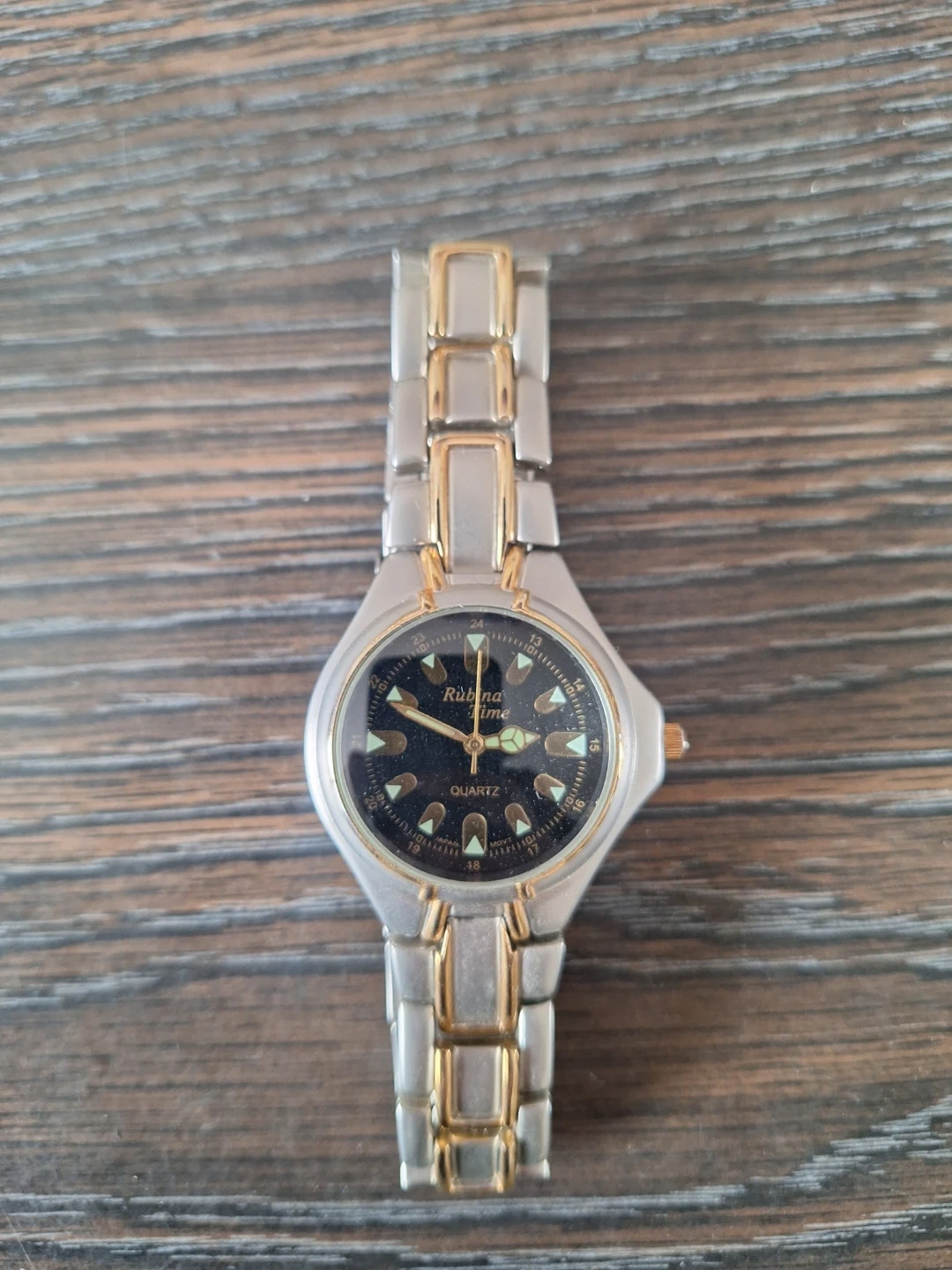 This Rubina Time watch features a two-tone silver and gold band. It's a quartz movement with a black face. This watch is suitable for everyday wear. Needs battery