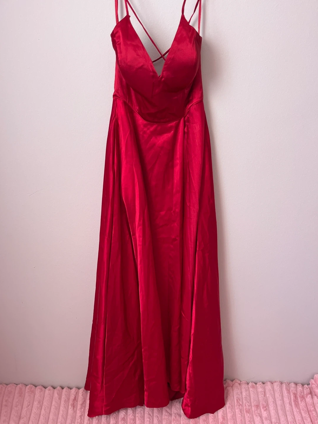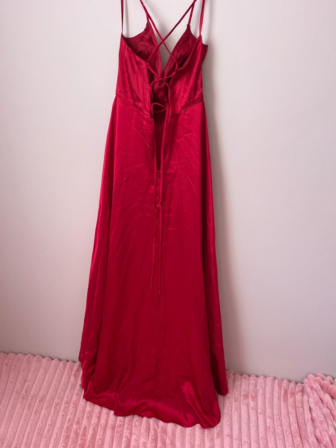 This Laura Petites dress is a beautiful red colour. It features thin spaghetti straps and a criss-cross lace-up back detail. Size is 6.